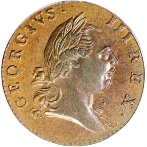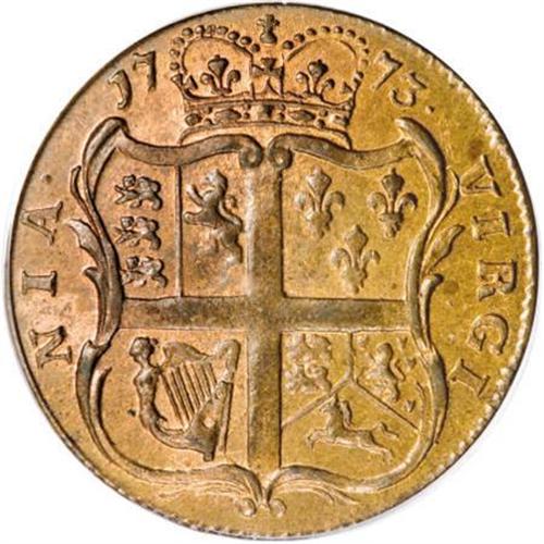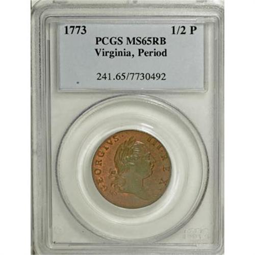 <B>1773 1/2P Virginia Halfpenny, Period MS65 Red and Brown PCGS.</B></I> Newman 24-K. The reverse is primarily orange-red, as is the left obverse margin. The portrait is olive-brown, and the right obverse field is blended rose-red and sea-green. A crisply struck Gem with only minor contact on the king's neck. Listed on page 43 of the 2008 Guide Book.<BR><I>From The Liberty Collection of United States Colonial Coinage.</B></I><BR><BR><b>Shipping:</b> Coins & Currency (<a target="_blank" href="http://www.heritageauctions.com/common/shipping.php">view shipping information</a>)