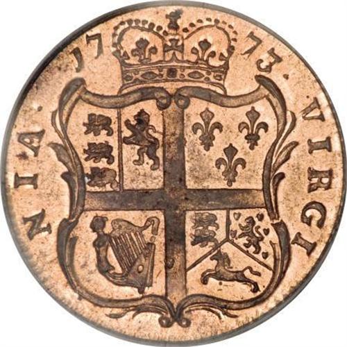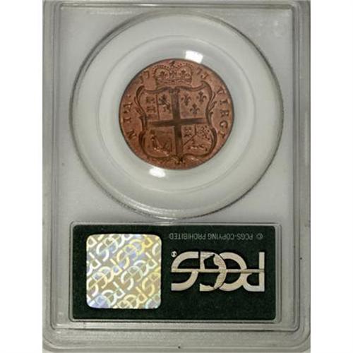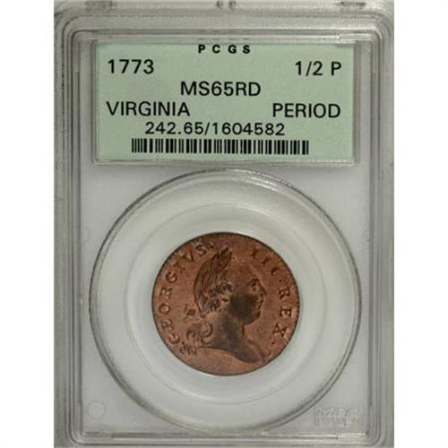 <B>1773 1/2P Virginia Halfpenny, Period MS65 Red PCGS.</B></I> Seven harp strings. Newman 25-M. In its appearance in the Heritage Detroit ANA Auction of July 1994, as lot 5008, the present piece was cataloged as "undoubtedly the finest example we can remember having seen. Struck on a highly polished planchet prior to striking, the coin has an exceptional brightness and freshness of color that is truly amazing. The bright red color is accented by brown only on the highest portions of the design elements on each side. Showing an unerring eye for quality, the consignor, David M. Faraday, purchased this coin from the Little Mint of San Francisco on November 7, 1967 for the princely sum of $75!" To this we can only add that the halfpenny is semi-prooflike, lacks noticeable marks, and is housed in a green label holder. Listed on page 43 of the 2008 <I>Guide Book</B></I>. Combined PCGS and NGC population: 1 in 65 Red, 0 finer as Red (3/08).<BR><BR><b>Shipping:</b> Coins & Currency (<a target="_blank" href="http://www.heritageauctions.com/common/shipping.php">view shipping information</a>)