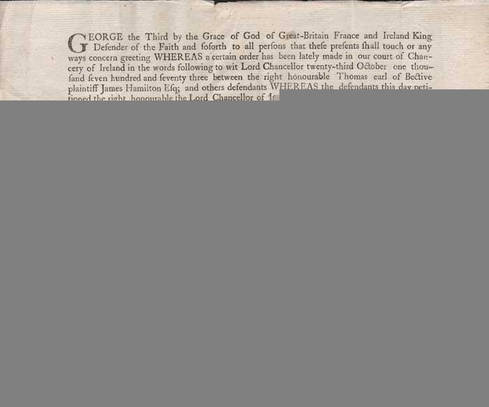 1773. A printed George III order by Lord Chancellor Deane and Lord Rigby, Master of the Rolls concerning Thomas Earl of Bective, and James Hamilton