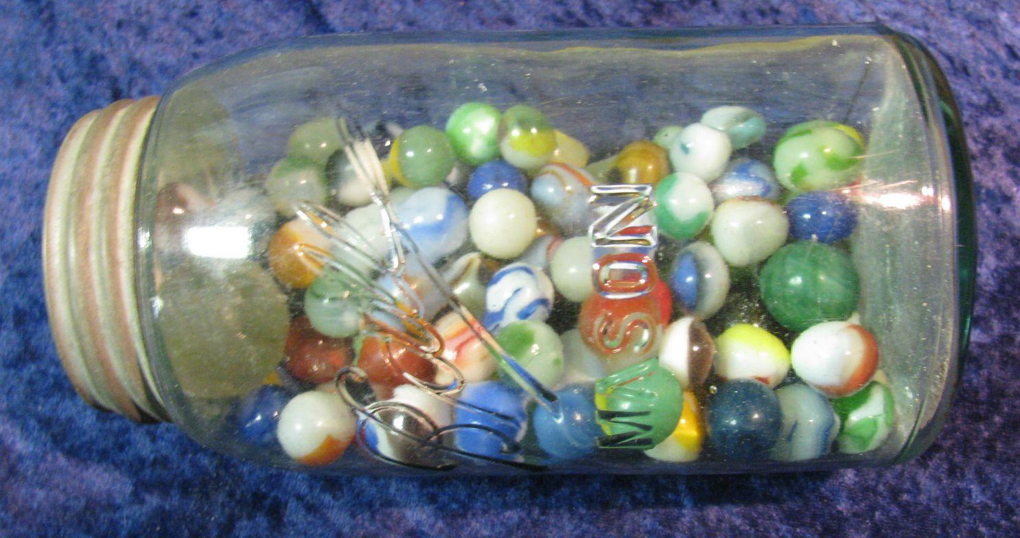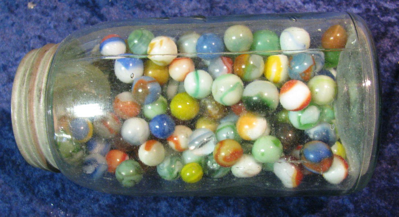 1773. Balls Mason Quart Jar with large group of Marbles.