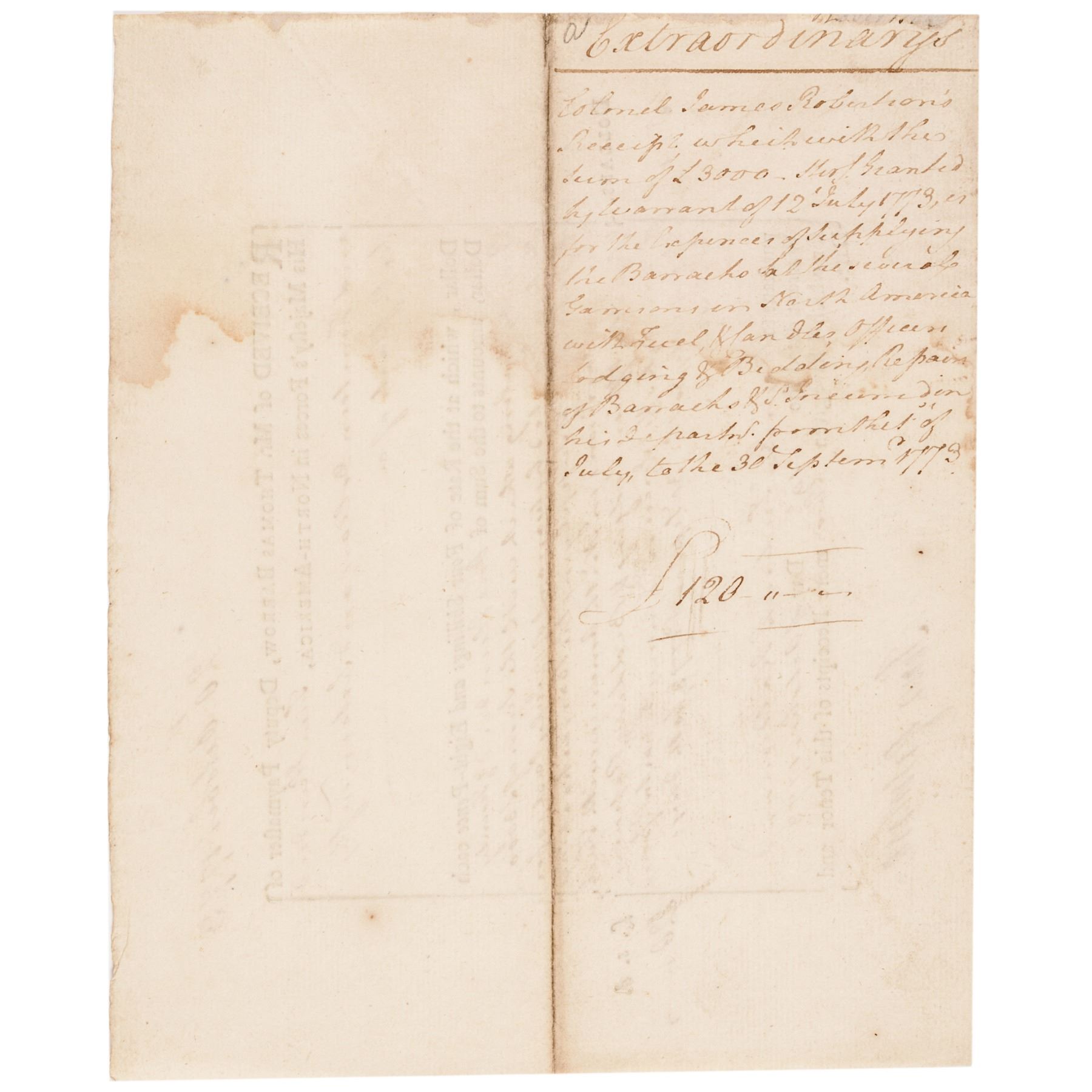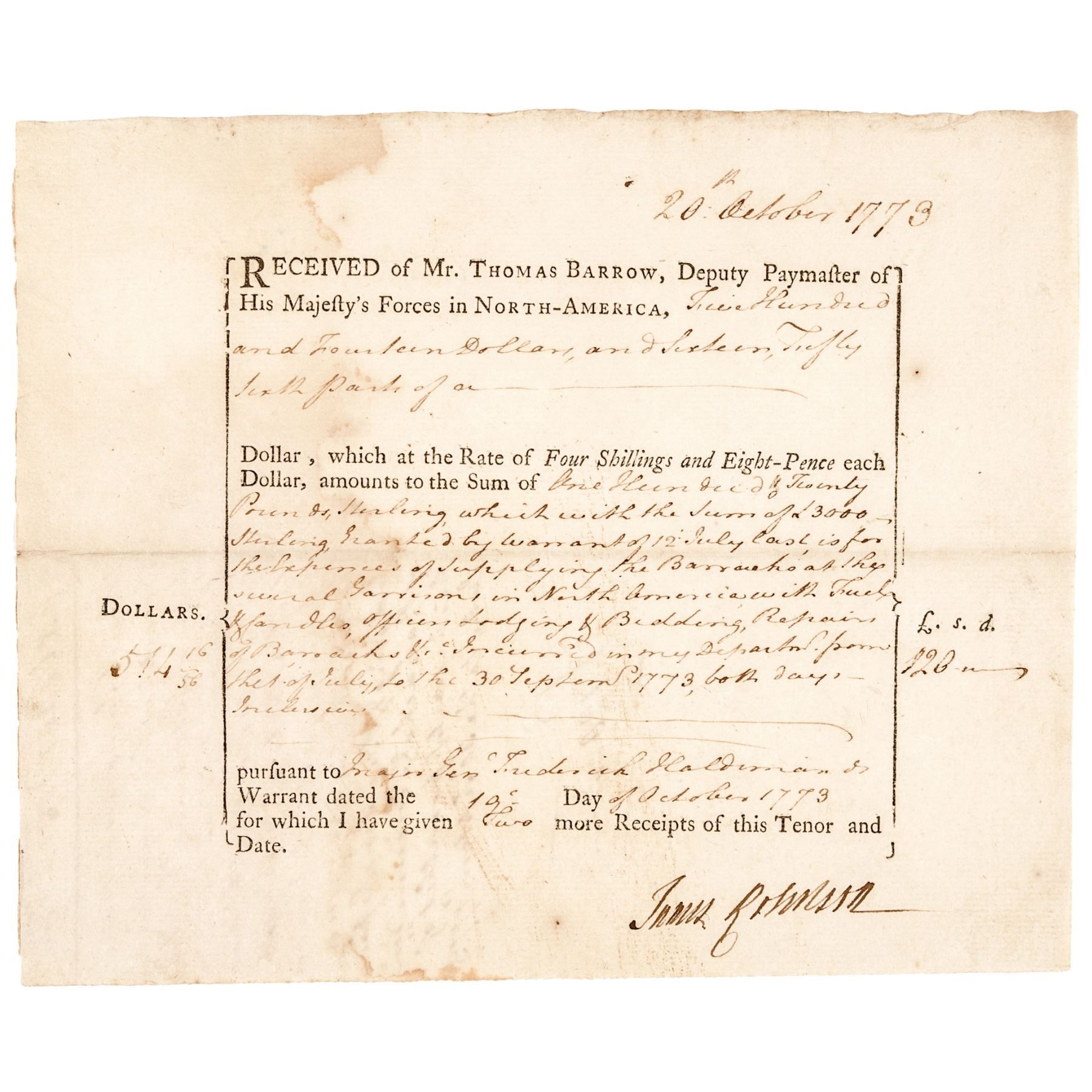 October 20, 1773-Dated Colonial America, Partially-Printed Pay Document Receipt Signed, “James Robertson,” measuring 6.5” x 8”, on fine quality watermarked period laid paper, Choice Very Fine. This pay receipt for “Five Hundred and Fourteen Dollars and Sixteen Fifty-Sixth Parts of Dollar” part of for supplying Barracks for several Garrisons in North America with officers and required supplies. Faint central horizontal fold and trivial dampstaining to left side, overall sharply printed and clean, overall quite nice.