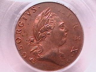 With Period. An exquisite example with nearly full red lustre! Very rare for a vintage copper coin to retain so much of its original surface and color. Authorized by the King in 1773 for use in Virginia.