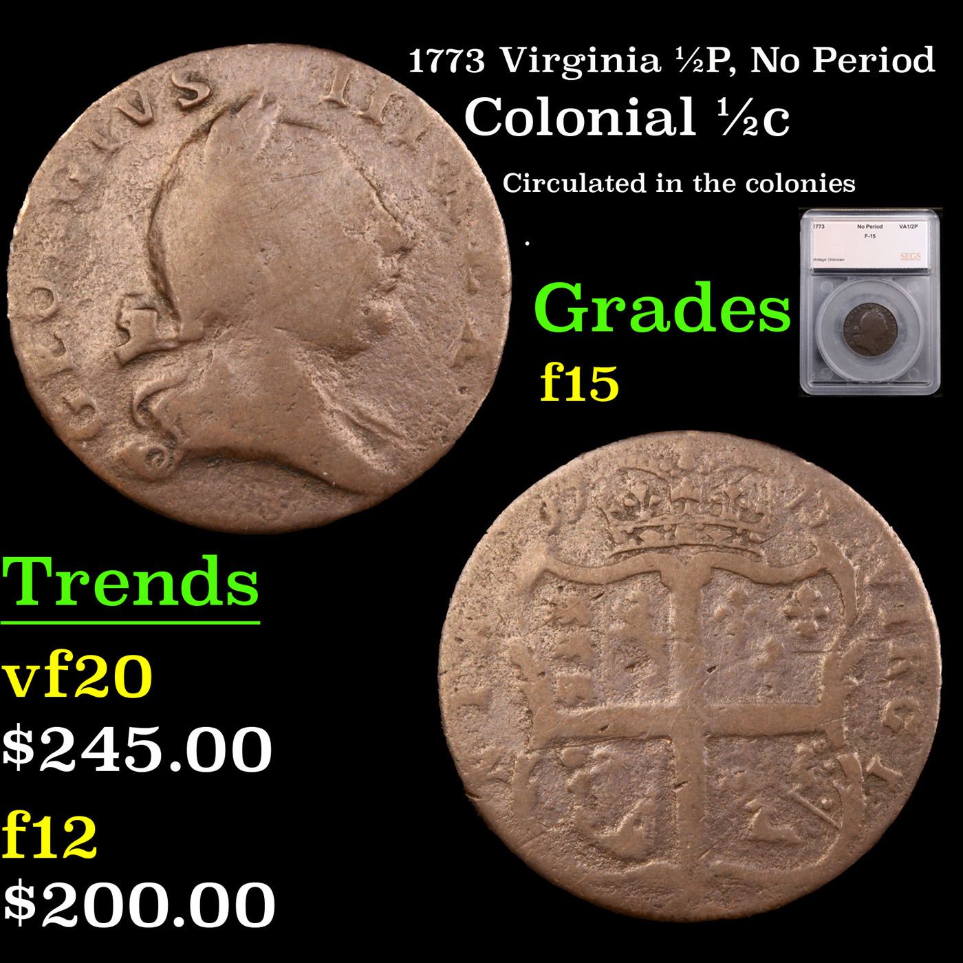 1773 Virginia 1/2P, No Period Colonial Half Cent 1/2c Graded f15 By SEGS.
