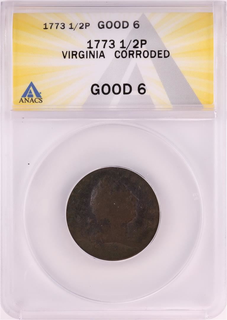 One 1773 Virginia Colonial Copper Half Penny Coin ANACS Good 6. ANACS Certified.