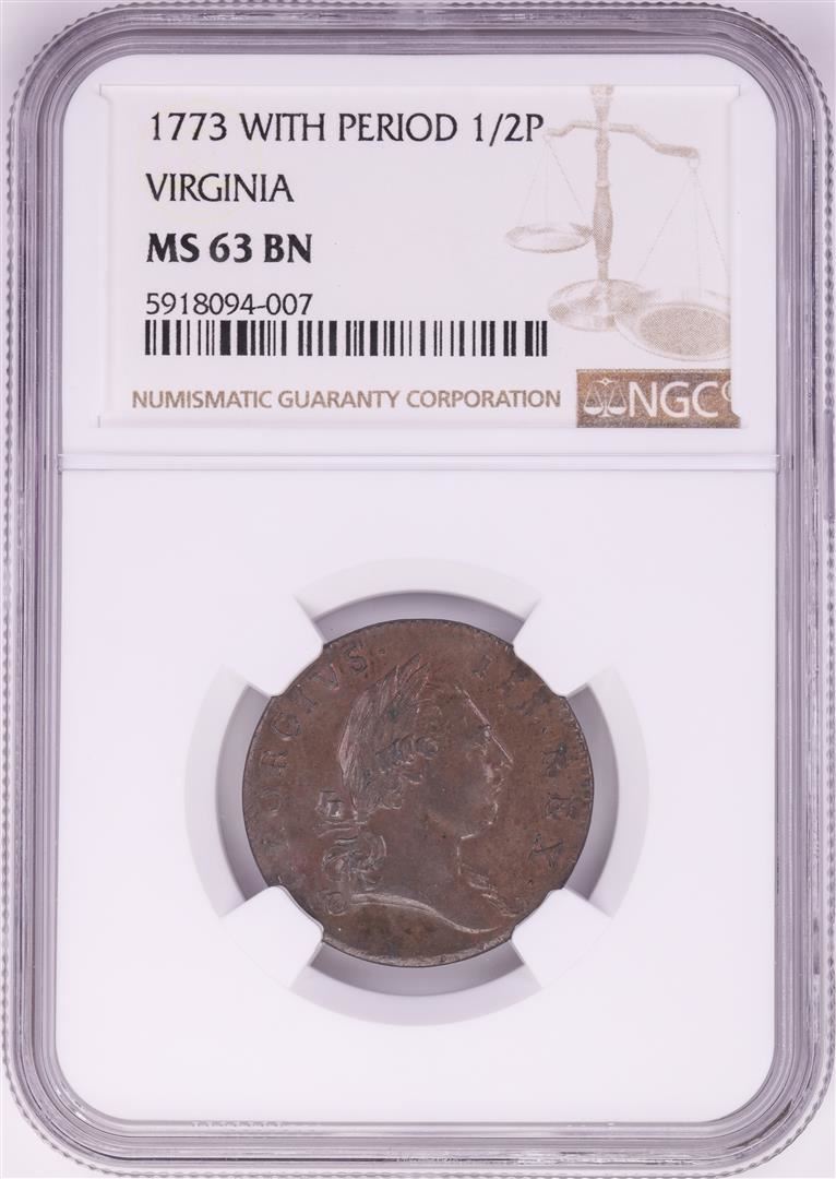 One 1773 With Period Half Penny Virginia Colonial Copper Coin NGC MS63BN. NGC Certified.