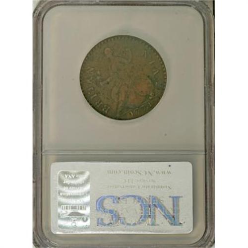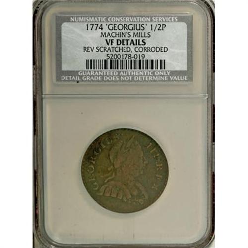 <B>1774 1/2P Machin's Mills 'GEORGIUS' Halfpenny--Corroded, Reverse Scratched--NCS VF Details.</B></I> NGC Census: (0/0). PCGS Population (0/4). (#454)<BR><BR><b>Shipping:</b> Coins & Currency (<a target="_blank" href="http://www.heritageauctions.com/common/shipping.php">view shipping information</a>)