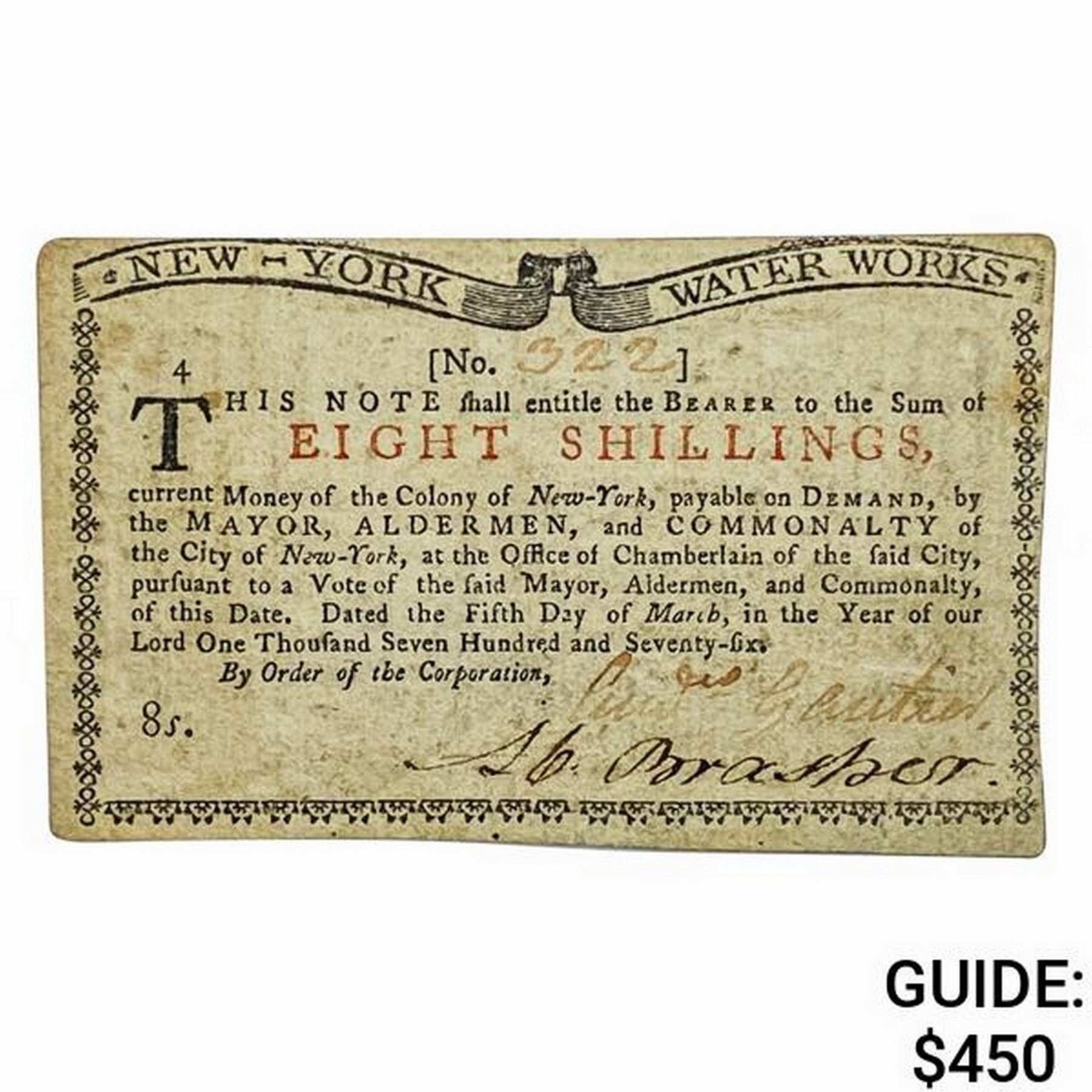 1774 8S Eight Shillings NY Water Works