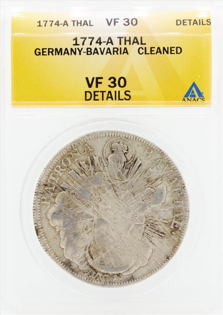 One 1774-A Thal Germany Bavaria Cleaned Coin ANACS VF30 Details. ANACS Appraised.