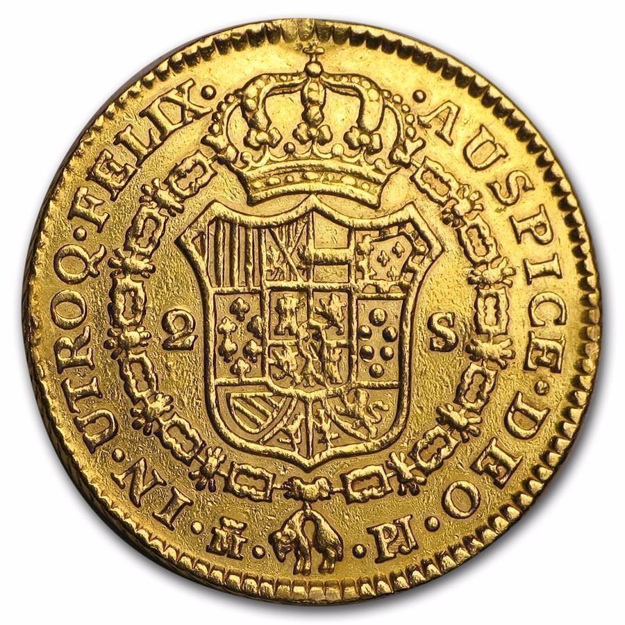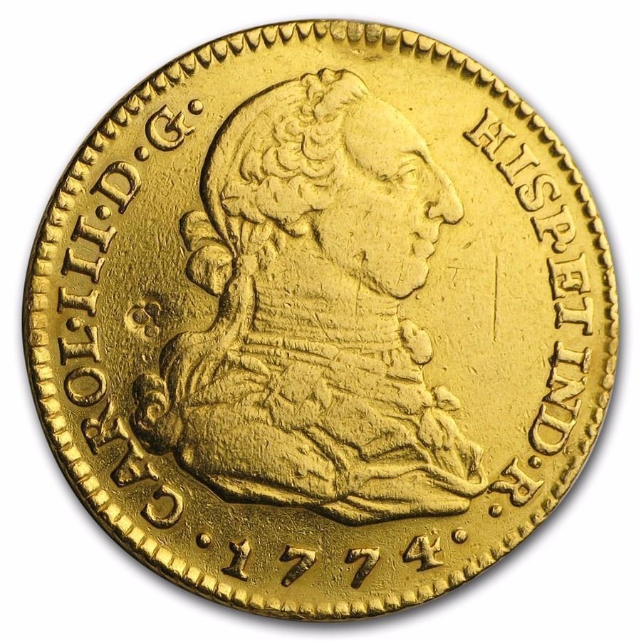 1774-M PJ Spain Gold 2 Escudo Coin AU 243 Years Old