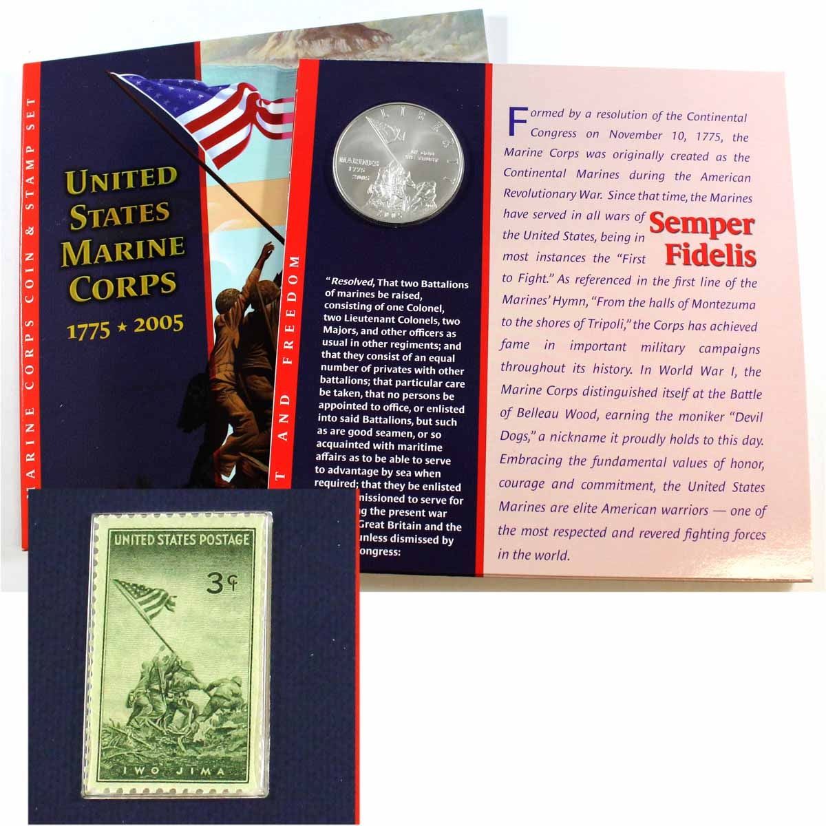 1775-2005 United States Marine Corp Silver Dollar and Stamp Set.