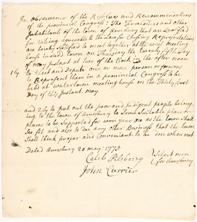 “In observance of the Resolves and Recommendations of the Provincial Congress: The Freeholders and other Inhabitants of the town of Amesbury that are qualified for Voting agreeable to the Laws of choosing Representatives are hereby Notified to meet together at the west meeting house in said town on Thursday, the twenty fifth day of May instant at two of the clock in the after noon (firstly) to elect and Depute one or more person or persons to represent them in a provincial Congress to be held at Watertown Meeting House on the thirty first day of this instant May - and (secondly) to put out the poor and indigent people belonging to the town of Amesbury to Some place or places to be supported for won (sic) year or as the town shall see fit... .” - “Dated Amesbury 20 May: 1775 - Caleb Pilsberry and John Currier.”