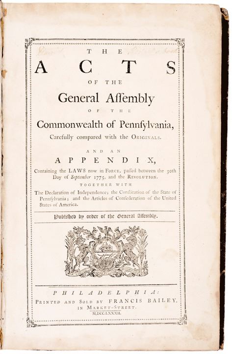 1782-Dated, Acts of Assembly, Province of Pennsylvania for September 30, 1775 and September 29, 1781, Large Volume, entitled, "Acts of the General Assembly of the Commonwealth of Pennsylvania,” Printed and sold by Francis Bailey, Market Street, Philadelphia, 1782, internally Choice Very Fine.