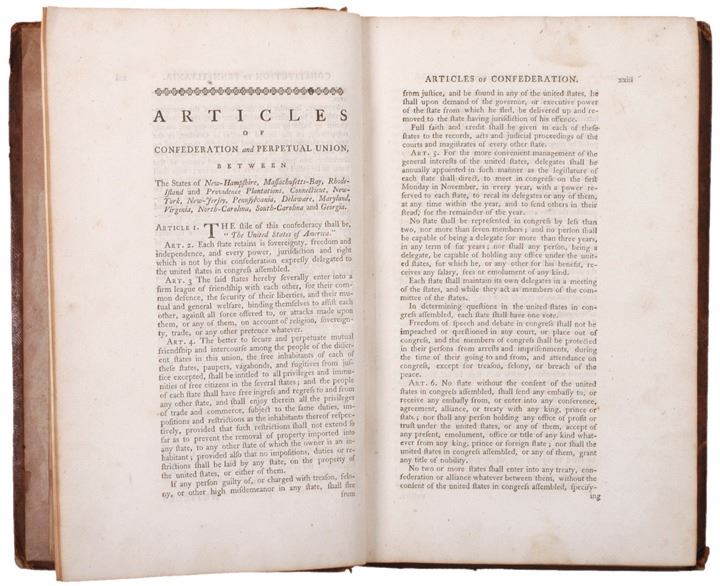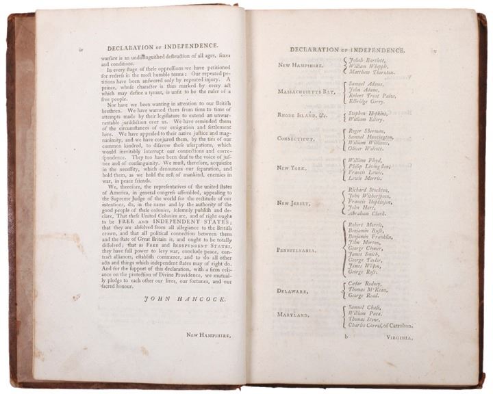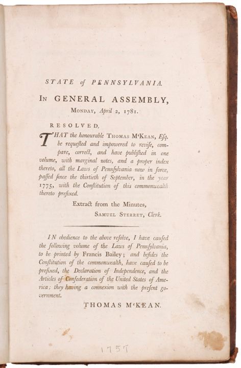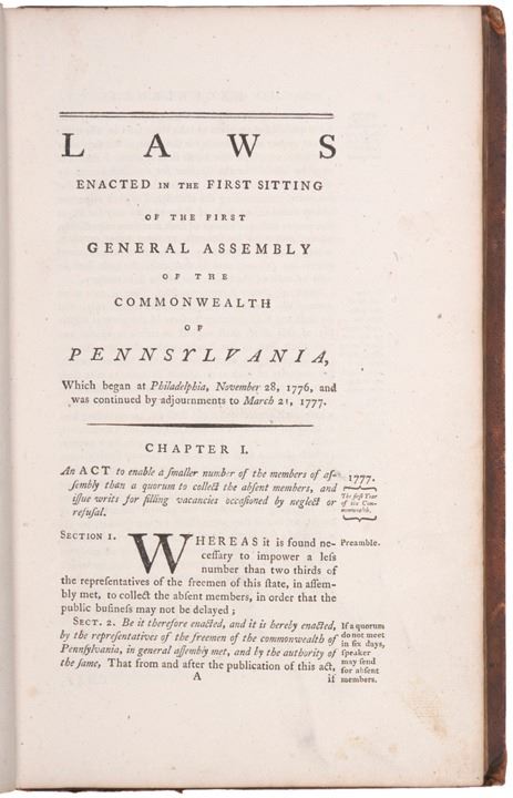 The first section includes a complete printing of the “Declaration of Independence,” the “Pennsylvania Constitution” and the “Articles of Confederation of the United States of America.” This large volume measures 12.25 x 8.25" containing the laws for the Province of Pennsylvania passed between September 30, 1775 and September 29, 1781, comprising the vast majority of the Revolutionary War period. It includes many early Revolutionary War period laws regarding acts of treason, oaths of allegiance, punishments for counterfeiters, and the borrowing of five million Continental Dollars! There is also an act for the creation of the American Philosophical Society (of which Benjamin Franklin was its first president). There is an Act providing a Tax on the "importation of Negros and Mulattos after July 4th 1776."