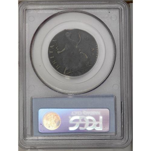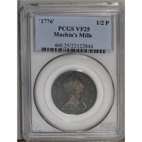 <B>1776<1/2P> Machin's Mills Halfpenny VF25 PCGS.</B></I> Vlack 6-76A, R.4. A better date within this "Tory Copper" series. Perhaps less wear than suggested by the grade, but the piece is darkly toned and moderately granular, and the seated effigy is softly struck. A small mint-made clip is noted at 6 o'clock. Listed on page 64 of the 2007 <I>Guide Book.</B></I>