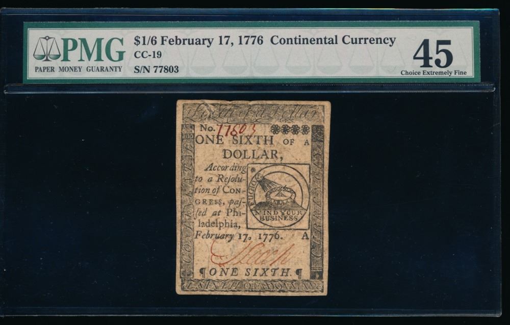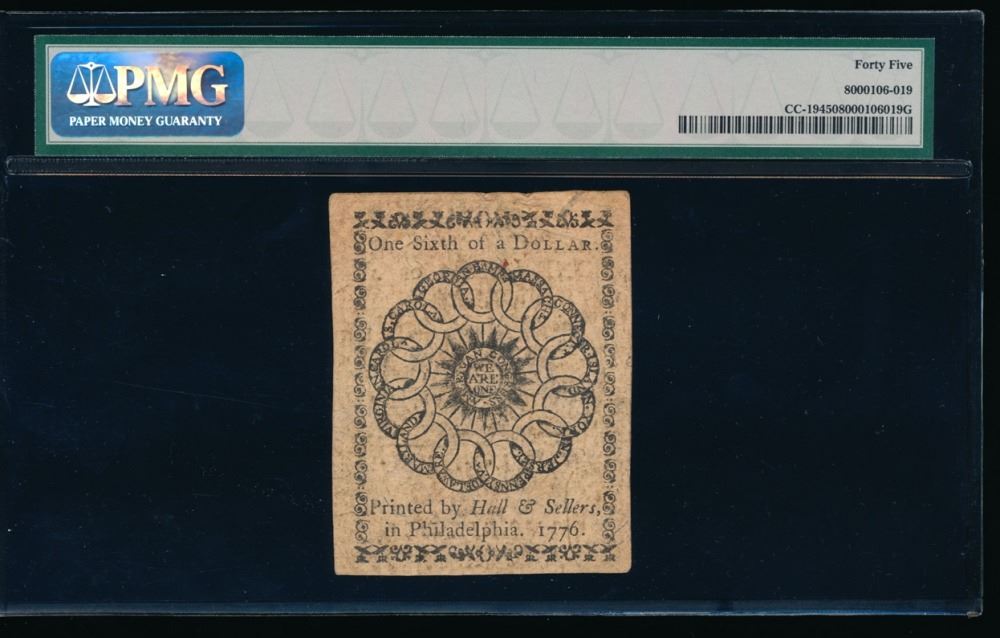 One 1776 $1/6 Dollar Continental Currency PMG 45.