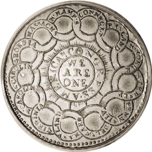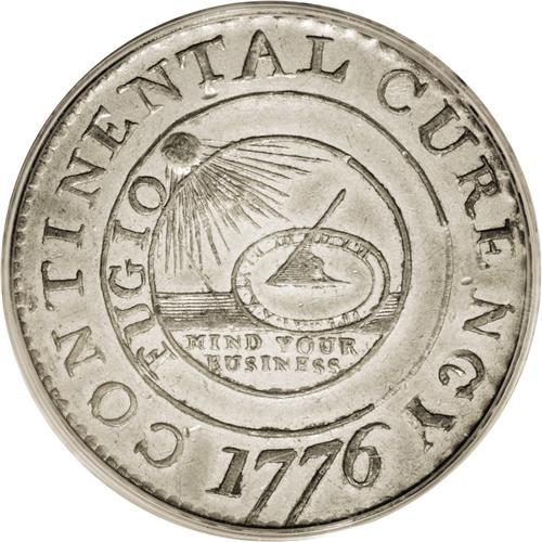 <B>1776<$1> Continental Dollar, CURENCY, Pewter MS64 PCGS.</B></I> Breen-1089, Newman 1-C, Hodder 1-A.3, R.3. This piece shows the diagnostic glory of rays on the reverse attenuated, especially at RESS M R, and incomplete border beading.<BR> Much quality research has been done on Continental "dollars" over the years, and after several speculative dead-ends, there seems to be agreement today on most of the important features of these coins. The first, and probably most important feature, is the nature of the coins themselves. According to Breen (1988), the United Colonies (so named before the country took the name United States) anticipated a loan of silver bullion from France in 1776. He later states: "Whatever the tin pieces might have represented, the copper and brass strikings most likely were pattern pence." Frankly, we cannot imagine a different purpose for the tin (more correctly pewter) coins other than as pattern pieces. Since they were struck in 1776, and since they were clearly not intended for circulation but as patterns for the expected shipment of silver from France (that never arrived), it is our position that these pieces are technically Colonial patterns. That is a narrow field of interest, rather than Colonials or patterns, but it does seem to us to be the logical way to view these pieces. The second feature of these coins is their composition. They have commonly been referred to as struck in pewter, and PCGS has designated this piece as such. Breen said they were struck in tin in his 1988 <I>Encyclopedia.</B></I> However, Bowers and Merena included the following entry directly following their description of a Newman 1-C in their Norweb Collection II catalog: "With the cooperation of Mr. Eric P. Newman, two of his pewter specimens were sent to ANACS for x-ray spectrographic analysis. The results were as follows ... tin: 84%, lead: 13%, copper: 1.5%, other trace elements. This analysis clearly establishes the fact that these pieces were made of a metal appropriately called pewter, or more technically, Ley metal. The older theory that these were made of over 90% tin can be laid to rest now." This conclusion was confirmed by Michael Hodder in the October 2003 sale of the John J. Ford Collection. He reported x-ray testing of certain examples and found that a pewter piece was composed of 83.7% tin, 13.3% lead, 1.6% copper, and 1.4% silver or trace elements. Again, pointing to a composition that we know as pewter.<BR> The obverse design is another feature that has been extensively researched. The sundial and FUGIO inscription was based on sketches by Benjamin Franklin. Apparently, Franklin had adapted his sketches from an eight-day clock constructed by David Rittenhouse in 1756 that bore the mottoes TEMPUS FUGIT and GO ABOUT YOUR BUSINESS. The Continental dollars, in turn, served as a model for the Fugio cents, struck 11 years later. Franklin also was the designer of the linked rings device seen on the reverse.<BR> At this grade level, this is one of the finest Continental dollars known. The surfaces are remarkably well preserved, especially considering the dull nature of lead, and the high content of that metal contained in these coins. Most of the original brightness can still be seen around the devices on each side with slight mellowing to medium gray seen elsewhere. The reverse shows a 270-degree rotation, a feature we have not seen on any other Continental dollar. The singular surface "flaw" that serves to identify and may help pedigree this piece in the future, is a teardrop-shaped planchet void beneath the second T in CONTINENTAL. There is also a curious broken letter punch on the bottom of the second C in CURENCY.<BR> These historic pattern pieces have a legacy that has endured since the time of the Confederation. This particular piece, with the misspelled word CURENCY, represents one of the finest known examples of this distinct type among Continental dollars. Population: 9 in 64, 2 finer (9/06).<BR><I>From The Hamburg-Sonoma Collection.</B></I>