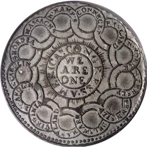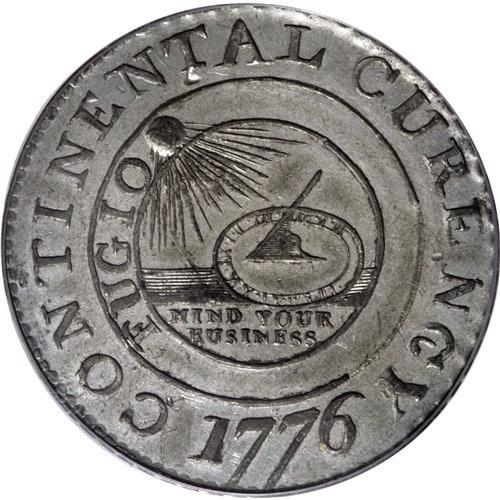 <B>1776 $1 Continental Dollar, CURENCY, Pewter MS64 PCGS.</B></I> Breen-1089, Newman 1-C, Hodder 1-A.3, R.3. This piece shows the diagnostic glory of rays on the reverse attenuated, especially at RESS M R, and incomplete border beading.<BR> Much quality research has been done on Continental "dollars" over the years, and after several speculative dead-ends, there seems to be agreement today on most of the important features of these coins. The first, and probably most important feature, is the nature of the coins themselves. According to Breen (1988), the United Colonies (so named before the country took the name United States) anticipated a loan of silver bullion from France in 1776. He later states: "Whatever the tin pieces might have represented, the copper and brass strikings most likely were pattern pence." Frankly, we cannot imagine a different purpose for the tin (more correctly pewter) coins other than as pattern pieces. Since they were struck in 1776, and since they were clearly not intended for circulation but as patterns for the expected shipment of silver from France (that never arrived), it is our position that these pieces are technically Colonial patterns. That is a narrow field of interest, rather than Colonials or patterns, but it does seem to us to be the logical way to view these pieces. The second feature of these coins is their composition. They have commonly been referred to as struck in pewter, and PCGS has designated this piece as such. Breen said they were struck in tin in his 1988 <I>Encyclopedia.</B></I> However, Bowers and Merena included the following entry directly following their description of a Newman 1-C in their Norweb Collection II catalog: "With the cooperation of Mr. Eric P. Newman, two of his pewter specimens were sent to ANACS for x-ray spectrographic analysis. The results were as follows ... tin: 84%, lead: 13%, copper: 1.5%, other trace elements. This analysis clearly establishes the fact that these pieces were made of a metal appropriately called pewter, or more technically, Ley metal. The older theory that these were made of over 90% tin can be laid to rest now." This conclusion was confirmed by Michael Hodder in the October 2003 sale of the John J. Ford Collection. He reported x-ray testing of certain examples and found that a pewter piece was composed of 83.7% tin, 13.3% lead, 1.6% copper, and 1.4% silver or trace elements. Again, pointing to a composition that we know as pewter.<BR> The obverse design is another feature that has been extensively researched. The sundial and FUGIO inscription was based on sketches by Benjamin Franklin. Apparently, Franklin had adapted his sketches from an eight-day clock constructed by David Rittenhouse in 1756 that bore the mottoes TEMPUS FUGIT and GO ABOUT YOUR BUSINESS. The Continental dollars, in turn, served as a model for the Fugio cents, struck 11 years later. Franklin also was the designer of the linked rings device seen on the reverse.<BR> At this grade level, this is one of the finest Continental dollars known. The surfaces are remarkably well preserved, especially considering the dull nature of lead, and the high content of that metal contained in these coins. Most of the original brightness can still be seen around the devices on each side with slight mellowing to medium gray seen elsewhere. The reverse shows a 270-degree rotation, a feature we have not seen on any other Continental dollar. The singular surface "flaw" that serves to identify and may help pedigree this piece in the future, is a teardrop-shaped planchet void beneath the second T in CONTINENTAL. There is also a curious broken letter punch on the bottom of the second C in CURENCY.<BR> These historic pattern pieces have a legacy that has endured since the time of the Confederation. This particular piece, with the misspelled word CURENCY, represents one of the finest known examples of this distinct type among Continental dollars. Population: 9 in 64, 2 finer (3/07).<BR><BR><b>Shipping:</b> Coins & Currency (<a target="_blank" href="http://www.heritageauctions.com/common/shipping.php">view shipping information</a>)