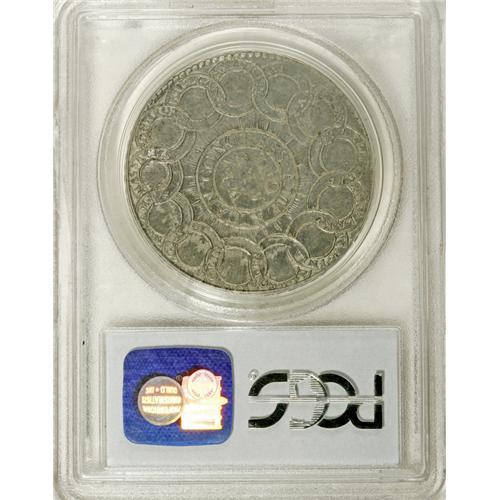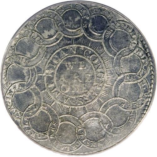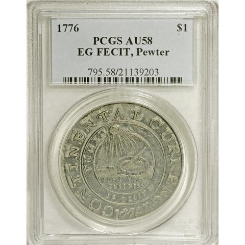 <B>1776 $1 Continental Dollar, CURRENCY, Pewter, EG FECIT AU58 PCGS.</B></I> Breen-1095, Crosby Pl. VIII, Newman 3-D, R.3. The EG FECIT variety, with the initials EG believed to represent Elisha Gallaudet. This light steel-gray example exhibits noticeable mint shimmer when it is rotated beneath a light, particularly throughout the reverse. Due to the die alignment, the strike is slightly soft on the obverse border at 5 o'clock, and on small portions of the Pennsylvania and New Jersey rings, but the remainder of this intricate design is well struck. Beautifully undisturbed aside from a few subdued minor marks on the field near the left edge of the sun's rays. Listed on page 81 of the 2007 <I>Guide Book. </B></I><BR><I>Ex: Columbus Central States Signature (Heritage, 4/02), lot 7860.</B></I><BR><I>From The Jones Beach Collection.</B></I><BR><BR><b>Shipping:</b> Coin/Currency (<a target="_blank" href="http://www.heritageauctions.com/common/shipping.php">view shipping information</a>)