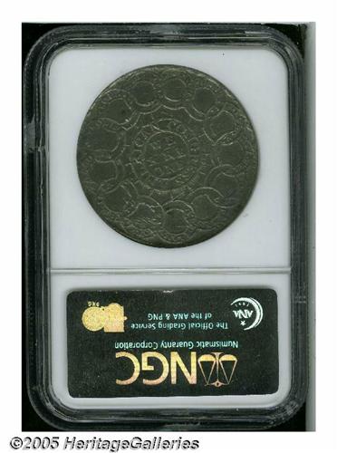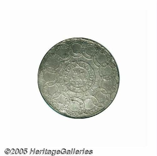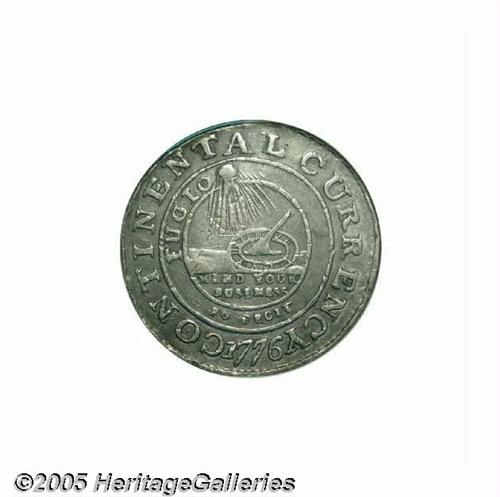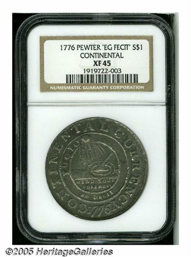 <B>1776<$1> Continental Dollar, CURRENCY, Pewter, EG FECIT XF45 NGC.</B></I> Newman 3-D, Hodder 3-B, R.3. Medium steel gray in color with slightly darker fields which offset the devices. This coin is sharply struck by the dies, and is an early die state before the reverse die crack advanced. Scattered handling marks are found with a loupe, but none are problematic. Identifiable by a minor nick at the top of the post of the 1 in the date. No tin pesting problems as often found, and this coin should find favor with any collector who appreciates the ample symbology and finer than average quality. Listed on page 39 of the 2005 <I>Guide Book. </B></I>