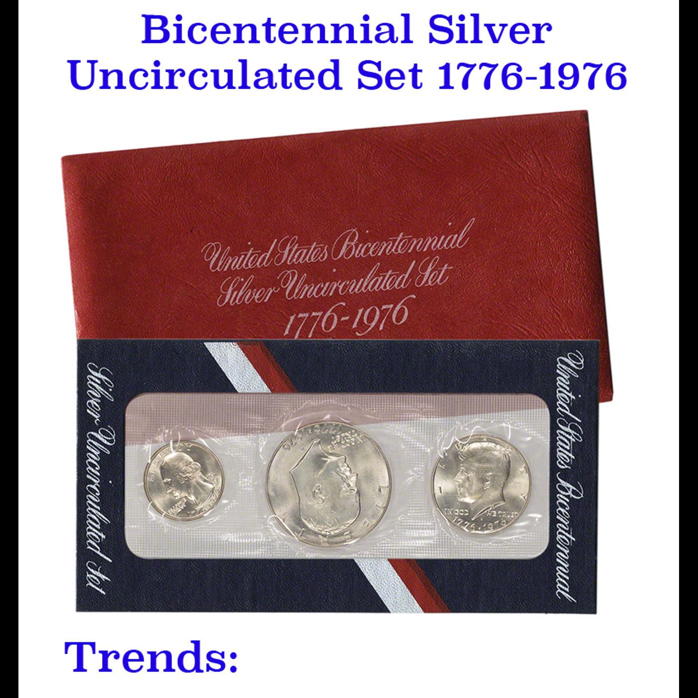 1776-1976 Bicentennial Silver Uncirculated set, the "Red Pack". Minted to celebrate the Bicentennial, this special set includes the 40% Silver Uncirculated Ike Dollar, the 40% Silver Uncirculated Kennedy Half Dollar and the 40% Silver Uncirculated Washington Quarter. Melt on this set is over $16.00 alone!!