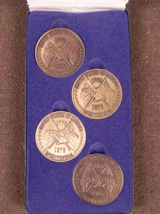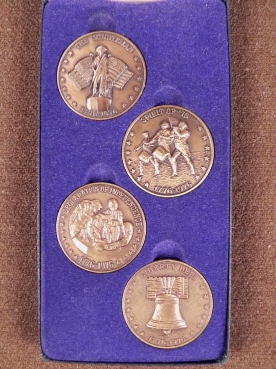 1776-1976 SET OF 4 CASED BRASS TYPE COMMEMORATIVE COINS-HISTORIC 1 1/2" IN DIAMETER-THEY COMMEMORATE THE MINUTEMAN, SPIRIT OF 76, DECLARATION OF INDEPENDENCE, LIBERTY BELL--ALL IN ATTRACTIVE CASE