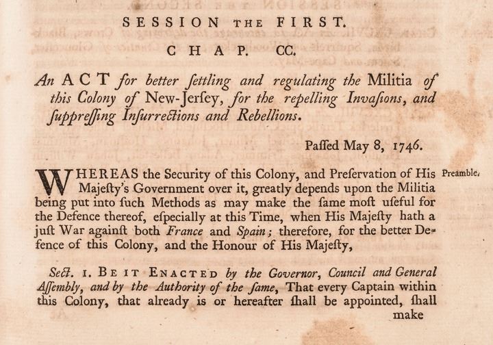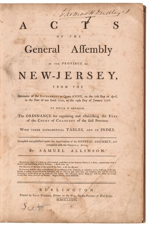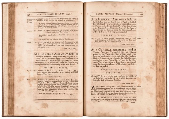 An NJ Official Acts covering the Early Colonial Laws from the period 1702 Queen Anne to 1776 to last Royal Governor William Franklin. This is a very nice copy of this rare original bound Book fully titled: “Acts of General Assembly of the Province of New Jersey, from the Surrender of the Government to Queen Anne, on the 17th Day of April in the Year of our Lord 1702, to the 14th Day of January 1776. To which is annexed, The Ordinance for regulating and establishing the Fees of the Court of Chancery of the Said Province. With Three Alphabetical Tables, and an Index. Compiled and Published under the Appointment of the General Assembly, and compared with the Original Acts, by Samuel Allinson. Burlington: Printed by Isaac Collins, Printed to the King, for the Province of New Jersey. MDCCLXXVI.”