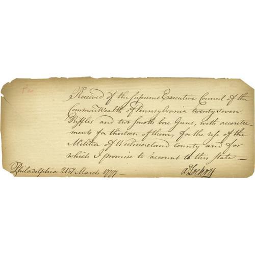 <B>1777 Autograph Letter Signed to General Hand</B></I> with a variety of war content, including raising additional troops for the frontier garrisons. Indians in Miami, Ohio would ironically, kill the writer. An additional very descriptive gun request signed by the doomed soldier is included. This 8" x 13" letter on plain paper dated June 27, 1777 reads, as written: "<I>Honored General, Agreeable to your orders I sent orders to the third and forth betalion for the complyment of men you will please to order 26 men to reinforce the garrison at Kittanany and 30 to be stationed on the frontiers. But can't get any from them betalion but an ensign and five privats. I maid...for the complyment of men wanting from the first and second betalion and there I but attended at the place of rendesvous which I then sent to your Honnour to receive their enstructions from you under the command of capt. Hugh Mastain the remainder of the men I will have raised as soon as possible and have them sent out to stations on the front as agreeable to your orders. I have rec't the ditamry for the officers of the of this county from the executive council of this command welth and will fine every militia man that has been ordered out on these commands and has not attended as soon the majestreets can be qualifyd. I have suspended Capt. Hopkins from doing daughty and will have him inj'd by court martial for his bad conduct for denying his orders to go to Kittanany and dismissing his party. I am sire your most oblig'd most humble serv't A. Lochry</B></I>". The gun request is written on a separate plain paper, measures 8" x 3" and reads: "<I>Received of the Supreme Executive Council of the Commonwealth of Pennsylvania twenty seven Riffles and two smooth bore guns, with accoutrments for thirteen of them, for the use of the Militia of Westmoreland County and for which I promise to account to this State. Philadelphia 21st March 1777 A. Lochry</B></I>".<BR><BR><b>Shipping:</b> Books & Catalogs (<a target="_blank" href="http://www.heritageauctions.com/common/shipping.php">view shipping information</a>)