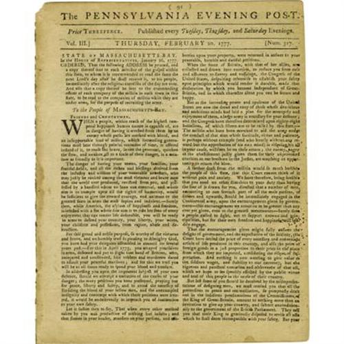 <B>1777 Edition of </B></I><B><I>The Pennsylvania Evening Post</B></I></B></I> <B>With Benedict Arnold Content.</B></I> Four pages, 7.5” x 9.5”, Volume III, Number 317. An interesting Revolutionary War period edition of the Pennsylvania newspaper filled with war news, lists of deserters, runaway slave notice and most importantly, a notice that “<I>The most Honorable the Congress of the United States of America have promoted Brigadier Arnold to the rank of Major General</B></I>…”. The pages have toned with age, with some foxing especially at the margins, else very good. <I>From the collection of Henry E. Luhrs.</B></I><BR><BR><b>Shipping:</b> Flat Material, Small (<a target="_blank" href="http://www.heritageauctions.com/common/shipping.php">view shipping information</a>)