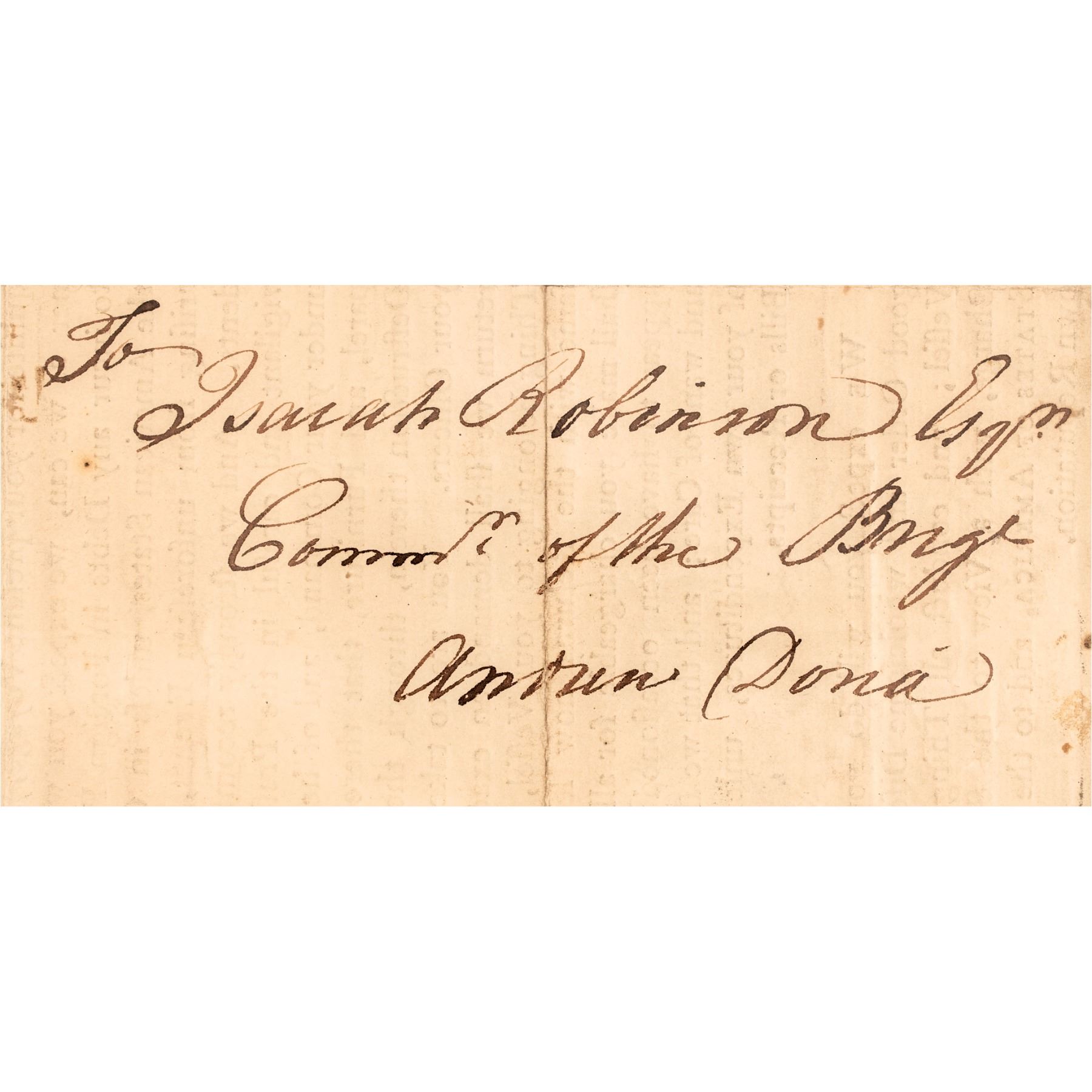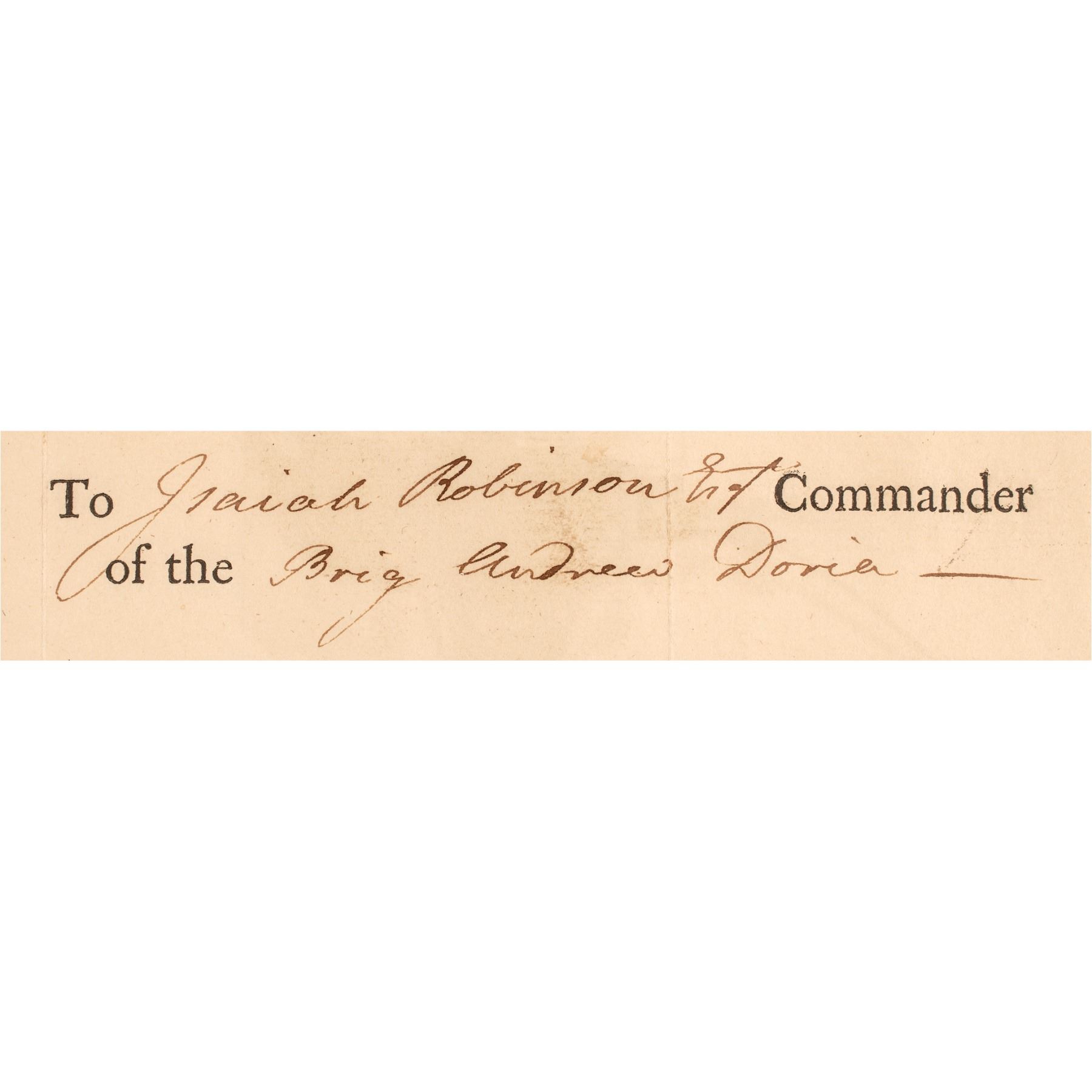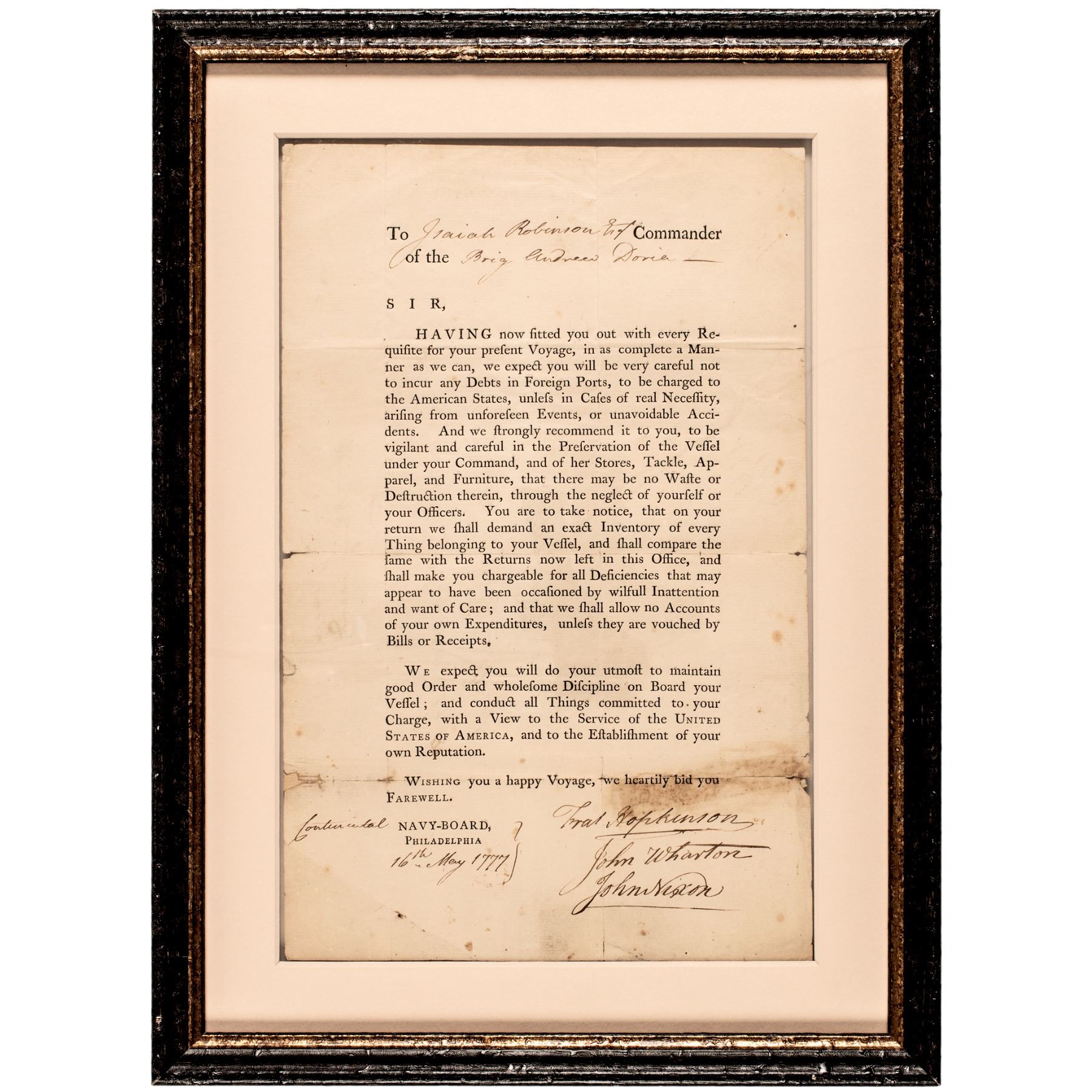 Exceedingly rare original Partly-Printed Continental Navy-Board Issued Commission Document, that measures about 8” x 12.25”, currently housed in a Double-sided Plexiglas, Both Sides Viewable frame, measuring to 12” x 16.25”. Being printed Instructions to “Isaiah Robinson Esq Commander of the Brig Andrea Doria. Sir, Having now fitted you out with every Requisite for your present Voyage, in as complete a Manner as we can... We expect you will do your utmost to maintain good Order and wholesome Discipline on Board your Vessel...” Issued by the “Continental Navy-Board, Philadelphia”. Signed at bottom “FRANCIS HOPKINSON”, “JOHN WHARTON” AND “JOHN NIXON”. Integral Addressed on the reverse where folded fro transmittal: To Isaiah Robinson Esqr / Commandr of the Brig / Andria Doria” and noted “Commission”. Two small early paper reinforcements on the reverse edge causing some light show-through, scattered foxing, and some fold edge wear as shown. Impressively presented, having the Board’s large prominent signatures at bottom right where ended with, “Wishing you a happy Voyage, we heartily bid you FAREWELL. “Continental” NAVY-BOARD, Philadelphia / 16th May 1777 Signed in brown ink, “FRANCIS HOPKINSON”, “JOHN WHARTON” AND “JOHN NIXON”.
