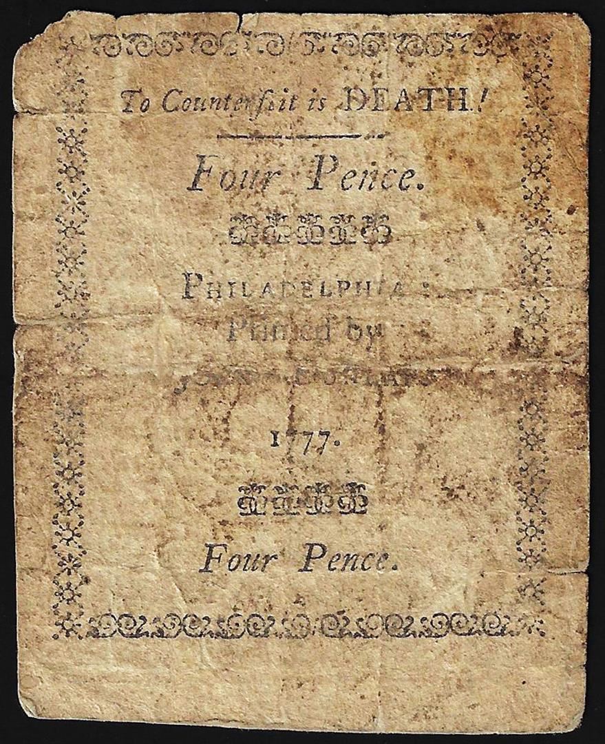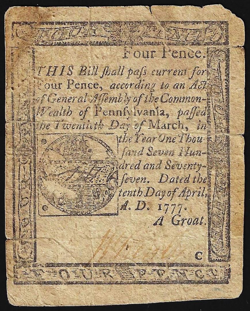 One 1777 Pennsylvania Four Pence Colonial Currency Note.