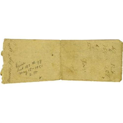 <B>1777 Revolutionary War Provisions Receipt Document.</B></I> One page, 6” x 2”, dated November 19, 1777. It reads in full: “<I>A Provition sic Return of Capt Dodges Company in Colo. Johnsons Regt for forty two men. Benjn. Gould Lieut.</B></I>” With fold creases, some tattering to the margins, and the usual toning to the paper, else very good. <I>From the collection of Henry E. Luhrs.</B></I><BR><BR><b>Shipping:</b> Flat Material, Small (<a target="_blank" href="http://www.heritageauctions.com/common/shipping.php">view shipping information</a>)
