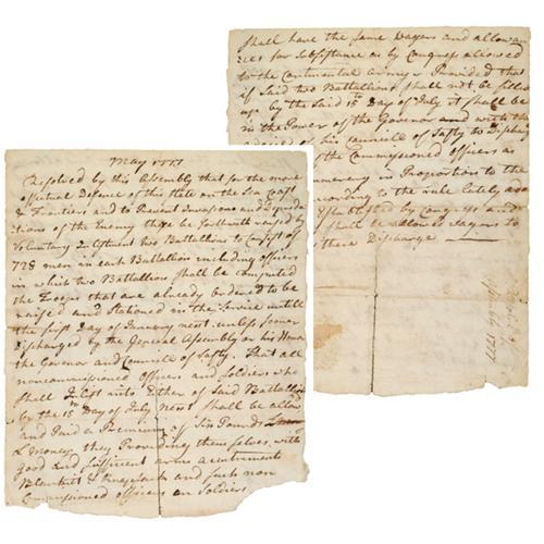 <Our item number 140905><B>1777 Revolutionary War Resolution Manuscript Document.</B> Manuscript document, being a resolution from the Connecticut state assembly for the establishment of two battalions of militia to protect the coast and frontiers of the state from the British, 2pp (recto/verso) 8 x 6 in., May 1777. In part: "Resolved by this Assembly that for the more effectual defense of this state on the Sea Coast & Frontiers and to prevent Invasions and Depredations of the Enemy there be forthwith raised two Battalions to Consist of 728 men in each Battallion including officers; in which two Battallions shall be computed the troops that are already ordered to be raised and stationed in the service until the first day of January next…That all noncommissioned Officers and Soldiers who shall Inlist into either of said Battallions by the 15th Day of July next shall be allowed and paid a Premium of Six Pounds L(egal) money, they Providing themselves with good and Sufficient arms, accoutreme nts, Blankits and Knapsacks; and such non-Commissioned officers and soldiers shall have the same wages and allowances for subsistence as by Congress allowed to the Continental Amy…." Very good; some chipping to the bottom, not affecting the writing, and a center fold separation at the bottom. <BR>Estimated Value $1,250 - 1,550. <BR><BR>Our item number 140905<BR><IMAGES><P ALIGN="CENTER"><IMG SRC="http://www.goldbergcoins.net/liveauction/49jpegs/140905.jpg"> </P></IMAGES>
