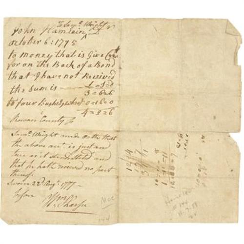 <B>1777 William Sharpe Document Signed</B></I> “<I>Wm. Sharpe</B></I>”. One page, 7” x 6.25”, Rowan County North Carolina , August 22, 1777, with contemporary marginalia, uniformly toned, some splits in the fold creases, else near very good. William Sharpe has signed this document as a witness to an outstanding and unpaid debt. Sharpe was a delegate to the Continental Congress from 1779 until 1781. <I>Ex. Henry E. Luhrs Collection</B></I>.<BR><BR><b>Shipping:</b> Flat Material, Small (<a target="_blank" href="http://www.heritageauctions.com/common/shipping.php">view shipping information</a>)