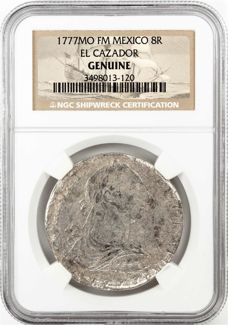 One 1777MO FF Mexico 8 Reales El Cazador Shipwreck Coin NGC Genuine. NGC Certified.