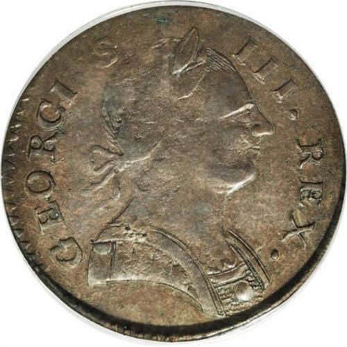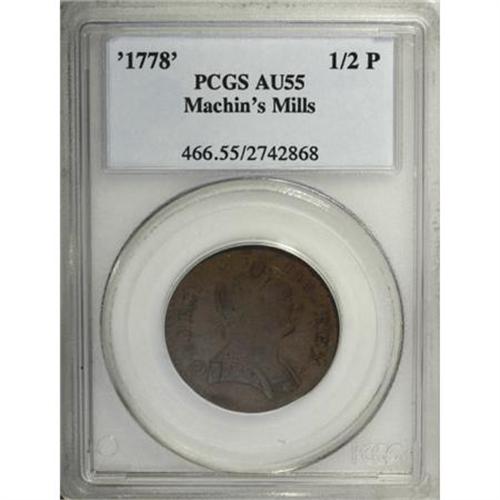 <B>1778 1/2P Machin's Mills Halfpenny AU55 PCGS.</B></I> Vlack 12-78B, R.3. Although Vlack 12-78B is traditionally listed as R.3, it shares a very low PCGS-certified population with two other "1778" varieties, and the present piece is the single-finest certified by that firm. The tan-brown surfaces exhibit slight strike doubling, and show only minor verdigris. Nicely struck with pleasing eye appeal for a Machin's Mills product, usually found in low grades. Listed on page 64 of the 2008 <I>Guide Book</B></I>.<BR><BR><b>Shipping:</b> Coins & Currency (<a target="_blank" href="http://www.heritageauctions.com/common/shipping.php">view shipping information</a>)