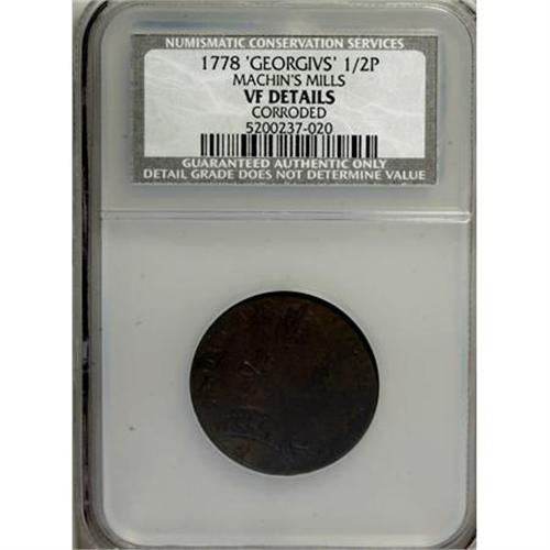 <B>1778 1/2P 'GEORGIVS' Machin's Mills Halfpenny--Corroded--NCS. VF Details.</B></I> NGC Census: (0/0). PCGS Population (1/6). (#466)<BR><BR><b>Shipping:</b> Coins & Currency (<a target="_blank" href="http://www.heritageauctions.com/common/shipping.php">view shipping information</a>)