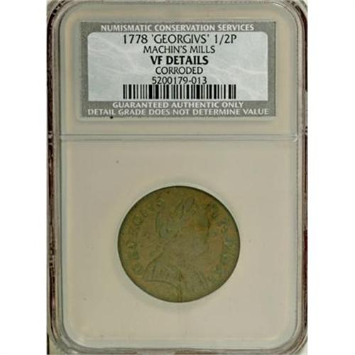 <B>1778 1/2P Machin's Mills 'GEORGIVS' Halfpenny--Corroded--NCS VF Details.</B></I> NGC Census: (0/0). PCGS Population (2/6). (#466)<BR><BR><b>Shipping:</b> Coins & Currency (<a target="_blank" href="http://www.heritageauctions.com/common/shipping.php">view shipping information</a>)