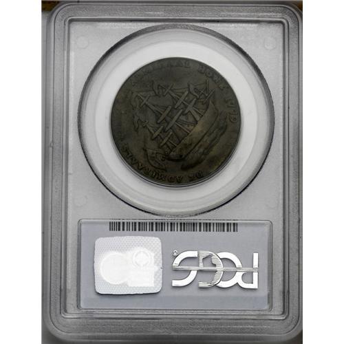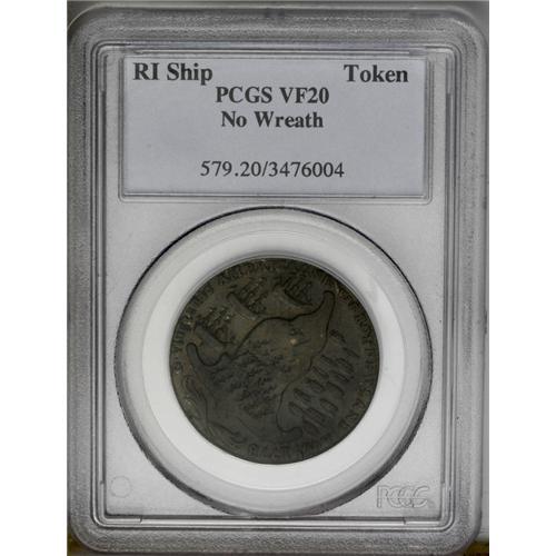 <B>1778-1779<TOKEN> Rhode Island Ship Token, No Wreath, Copper VF20 PCGS.</B></I> Breen-1139, Betts-562. The olive and chocolate-brown surfaces are unblemished, and the types apparent despite noticeable wear. The upper left reverse legend is nearly smooth. The legend VLUGTENDE beneath the ship was removed after the strike but prior to issue, as usual for the variety. Listed on page 48 of the 2007 <I>Guide Book.</B></I>