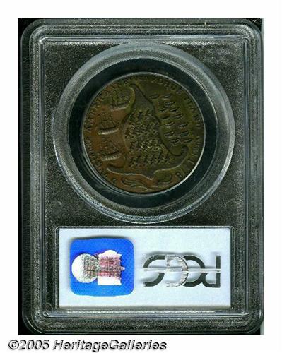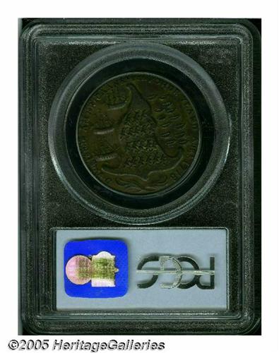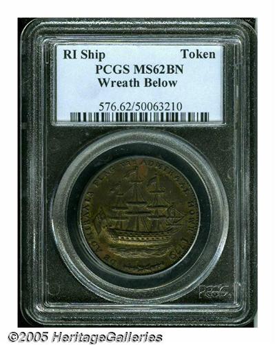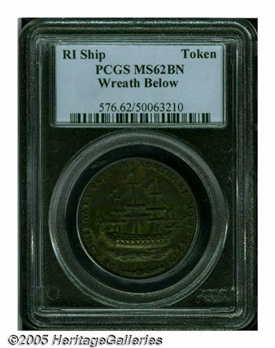 <B>1778-1779<TOKEN> Rhode Island Ship Token, Wreath Below, Copper MS62 Brown PCGS.</B></I> Breen-1141, Betts-563. A satirical piece initially intended for a Dutch audience, which mocks both the American militia and the British Admiral Howe for having to abandon Newport in 1778-79. Betts-563 is the final entry in the series, the word VLUGTENDE replaced on the die with a wreath. A well struck example, mostly deep chocolate-brown in color with lighter olive hues within and outlining the devices. A few old pinscratches are concealed to the right of Rhode Island. Listed on Page 35 of the 2005 <I>Guide Book.</B></I> Population: 3 in 62, 0 finer (6/05).<BR><I>From The Melrose Bay Collection.</B></I>