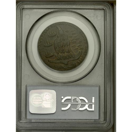 <B>1778-1779 TOKEN Rhode Island Ship Token, Wreath Below, Copper AU58 PCGS.</B></I> Breen-1141, Betts-563. Despite the satirical nature of this token, economic necessity permitted it to circulate along with other non-monetary coppers of the era. This piece, coined in copper or brass, is deep brown with streaks of pumpkin-orange on the reverse. Listed on page 48 of the 2007 <I>Guide Book.</B></I> Population: 5 in 58, 3 finer (10/06).<BR><BR><b>Shipping:</b> Coin/Currency (<a target="_blank" href="http://www.heritageauctions.com/common/shipping.php">view shipping information</a>)