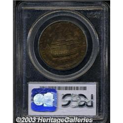1778-1779 TOKEN Rhode Island Ship Token, Wreath Below, Brass MS64 PCGS. Breen-1141. Betts-563. The Rhode Island ship medal was struck in England circa 1779-1780, while the Revolutionary War was still in progress. The peripheral legends imply a Dutch audience for the medal, and refer to a British naval victory. This well struck piece is free from visible contact or carbon. Mellowed orange-red and yellow-gold color graces this original near-Gem. Listed on page 29 of the 2003 Guide Book. Population: 2 in 64, 0 finer (10/03). Important notice: Heritage usually auctions material at the rate of 200-250 lots per hour. On some occasions eBay Live bid software or the Internet may not be able to keep up with the pace of the auction. We recommend placing a realistic absentee bid now as insurance to avoid disappointment. Occasionally the auctioneer may eliminate or reject an eBay Live bid, and the auctioneer may also reopen a lot after the close of the eBay live bidding (usually because we missed an audience bid), and may reject your bid even if it shows you as the winning bidder. By bidding via eBay Live, you agree that Heritage may award the lot to another bidder at its sole discretion under the circumstances described above or any other reasonable circumstances. Also please note that all Heritage lots purchased through eBay Live carry a 20% Buyer's Premium. Please make sure you read the Terms and Conditions before you bid.