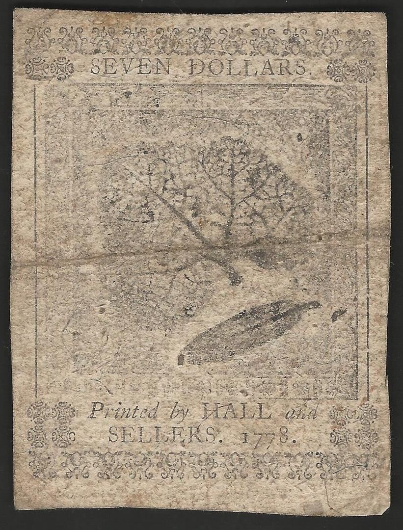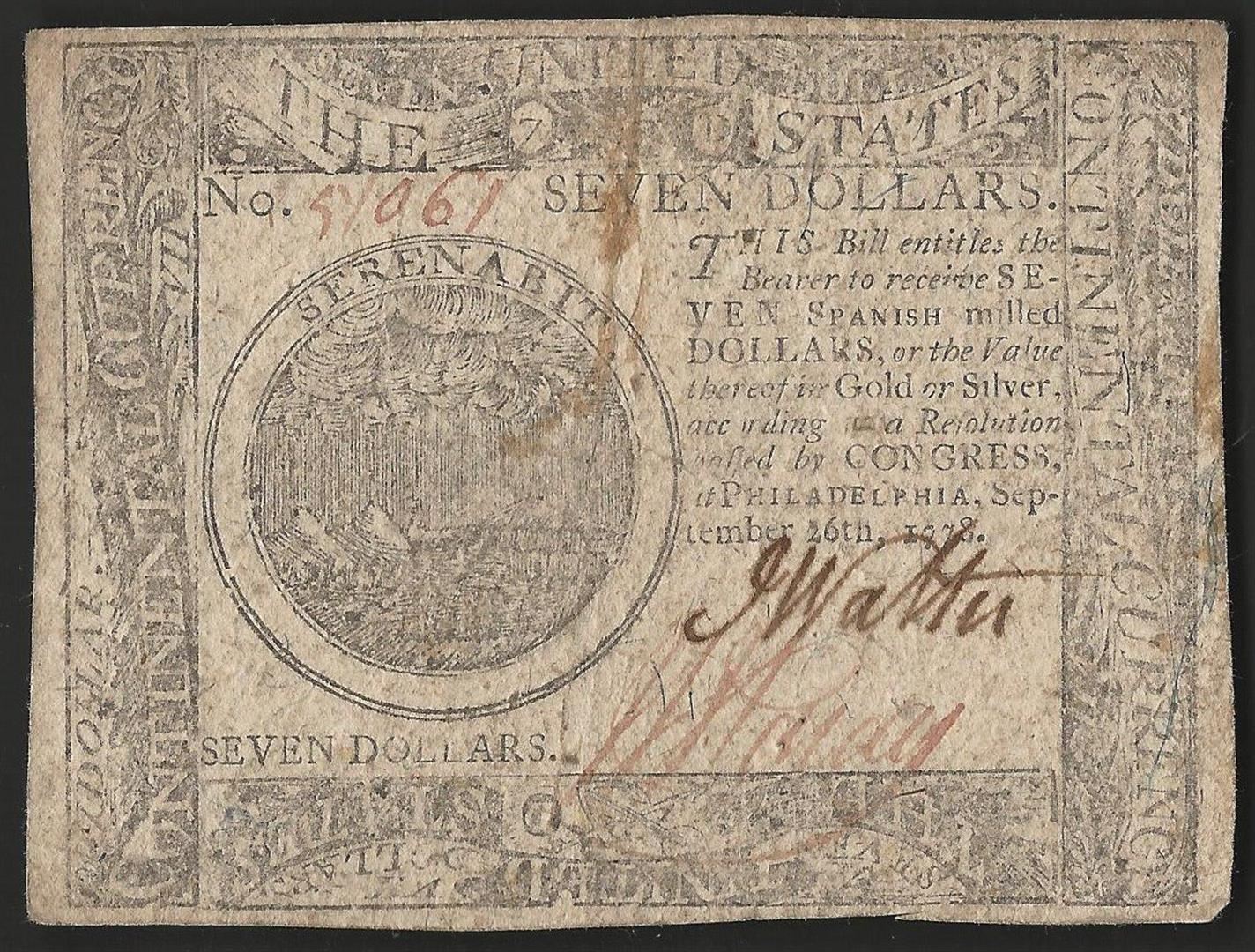 One 1778 $7 Spanish Milled Dollars Continental Currency Note.