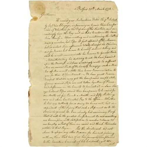 <B>1778 Letter Written to General Hand Regarding the Raising of Volunteers.</B></I> Two pages, 8” x 13.25”, Bedford, March 20, 1778, signed by George Wood, David Espy and Benjamin Elliot, to Brigadier General Edward Hand and George Clymer, Ft. Pitt. In this letter Wood, Espy and Elliot acknowledge their orders for raising three companies of volunteers but complain that a certain Colonel Piper has made their task impossible by offering to pay officers more than the rate established by the Continental Army. It reads in part: “<I>…We have already had convincing Proofs that it will be the greatest Impediment to our executing our Commission with Satisfaction to ourselves & Service to our Country, as Part of them are raised to think themselves entitled to that Pay.</B></I>” The letter is ragged at the margins and splits in the creases, but still bright and legible with the usual fold creases, else very good. <I>Ex. Henry E. Luhrs Collection.</B></I> <BR><BR><b>Shipping:</b> Flat Material, Small (<a target="_blank" href="http://www.heritageauctions.com/common/shipping.php">view shipping information</a>)