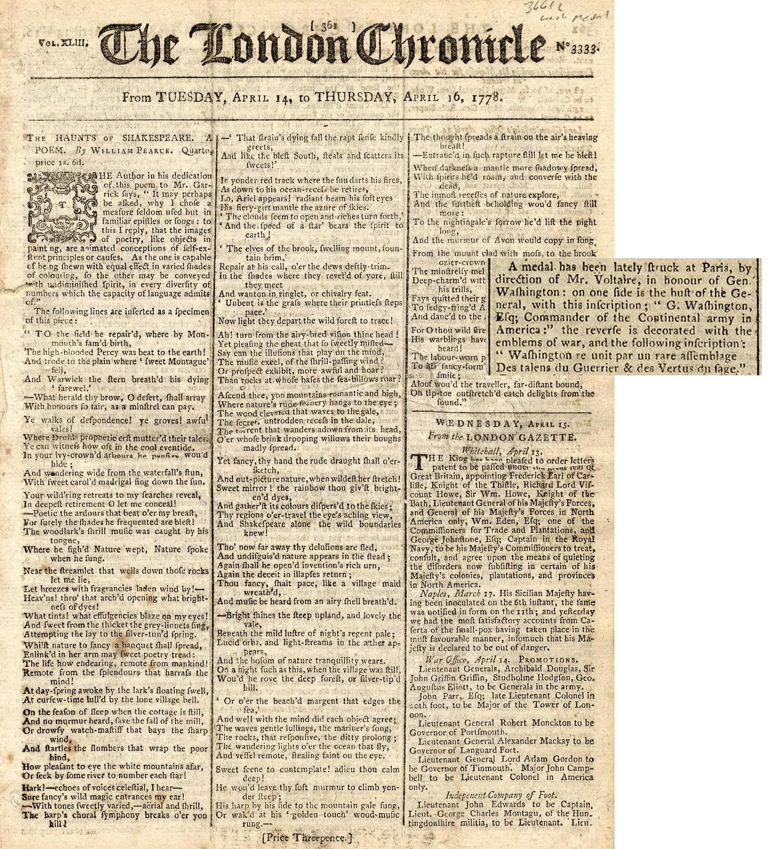 Revolutionary era edition of ''The London Chronicle'' dated Tuesday, 14 April to Thursday, 16 April 1778. Page six article reads in part, ''…A Medal has been struck in Paris, by direction of Mr. Voltaire, in honor of Gen. Washington: on one side is the bust of the General, with this inscription; ‘G. Washington, Esq; Commander of the Continental army in America.''' Newspaper runs 8pp. and measures 8.25'' x 11.25''. Binding loose as result of removal of this edition from larger volume. Slight toning, overall near fine condition.