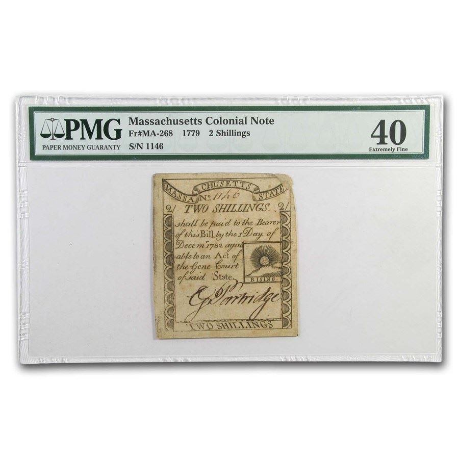 1779 2 Shillings Rising Sun Massachusetts Currency XF-40 PMG