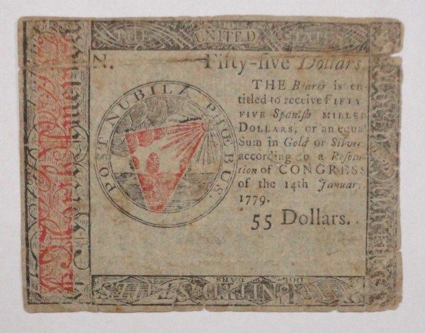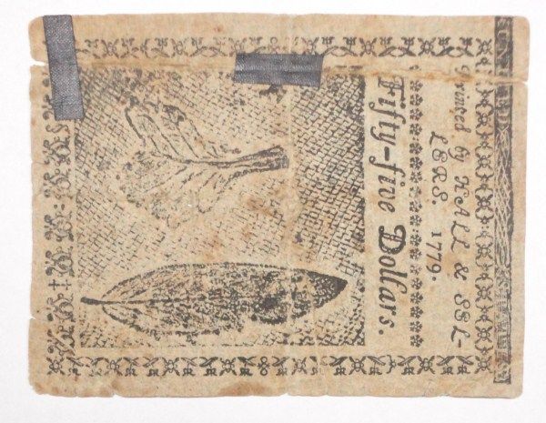 CONTINENTAL CURRENCY USED TO BE REDEEMED FOR EQUAL VALUE IN GOLD OR SILVER, HAS BEEN TAPED IN TWO PLACES PINHOLES, EST. $125.00 TO $140.00