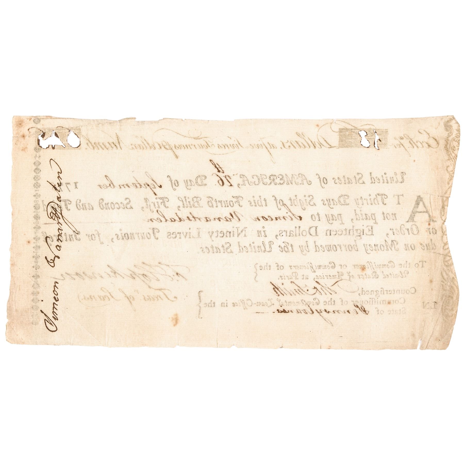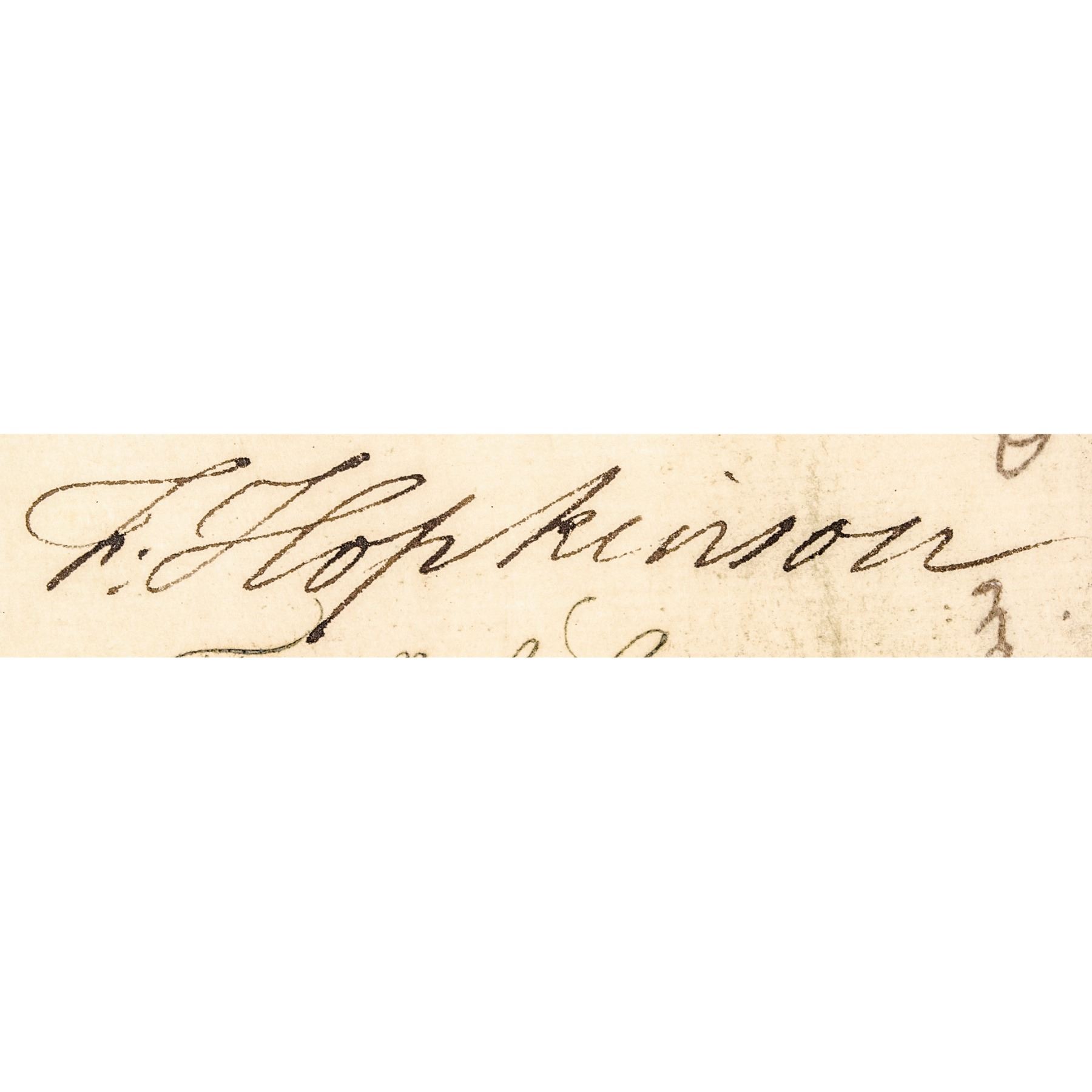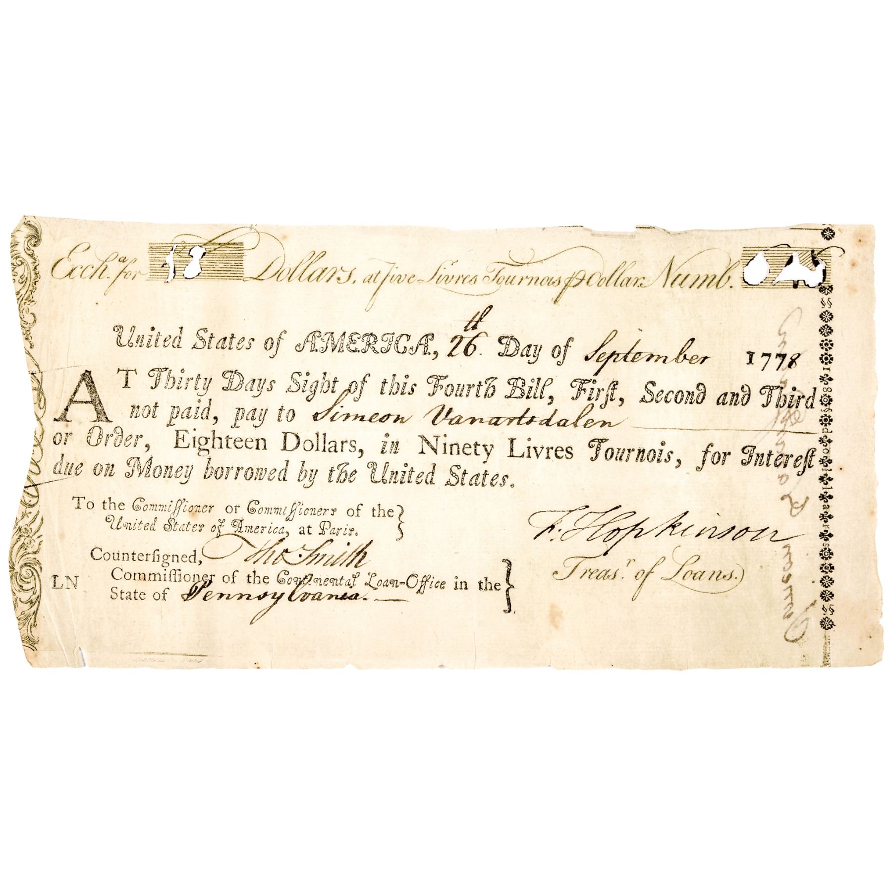 September 26th, 1778-Dated Revolutionary War Period, Partly-Printed Document Signed, “Fr. Hopkinson” as United States of America Continental Congress Treasurer of Loans, 1 page, measuring 7.25” x 3.5”, Choice Extremely Fine. Continental Congress Treasurer of Loans form on the State of Pennsylvania, made to the well regarded (Reverend) Simeon Van Artsdalen. Being a Fourth Bill of Exchange, this bright, clean and fresh Continental Treasury form is beautifully printed in green and black, upon watermarked “UNITED STATES 4” fine quality laid period paper. Two small ink erosion holes at top in the written number “18” and on the serial number. It is made to (Reverend) “Simeon Van Artsdalen” (1753-1786) Pastor at the Dutch Reformed Church of Readington, New Jersey; (he graduated Queens College in 1780 and was well known for his discourse on owning Slaves and Slavery, even though he himself owned two Slaves!). This Certificate made for $18 on “Interest due on Money borrowed by the United States.” Countersigned “Tho: Smith” as Commissioner of the Continental Loan-Office in the State of Pennsylvania. “To the Commissioner or Commissioners of the United States at Paris.” Endorsed on the blank verso by the noted (Reverend) “Simeon Van Artsdalen.” This impresive Certificate made to and endorsed by having a 2.75” long superb, vivid deep brown “Fr(ancis) Hopkinson” signature.