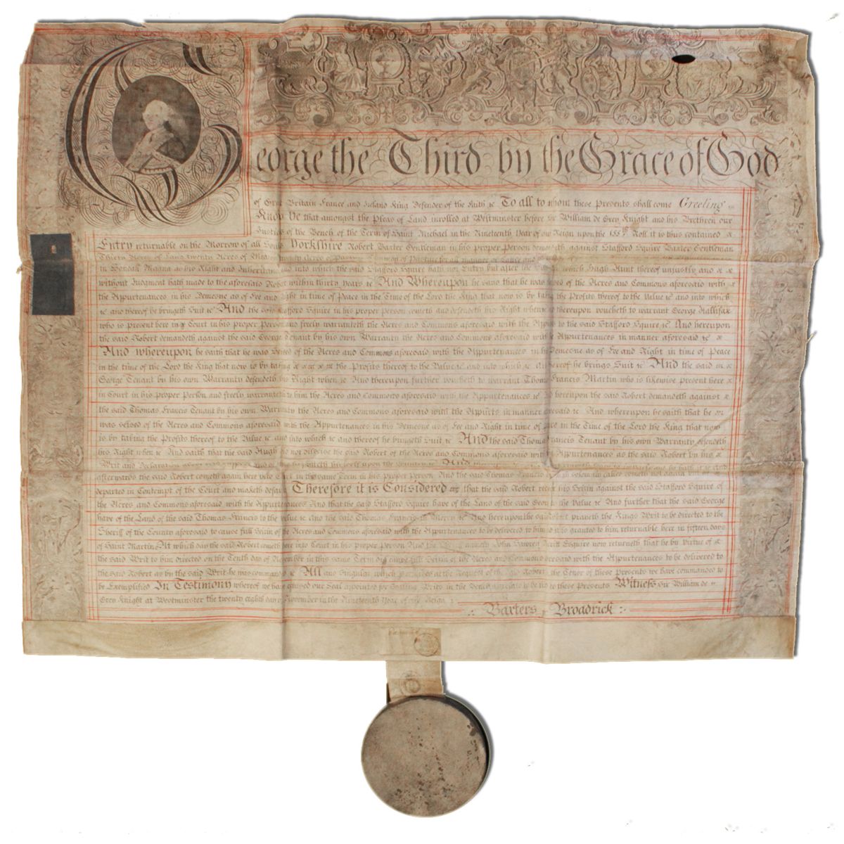 Large 30'' x 25'' land grant dated 19 November 1779, during the reign of King George III of England: ''George the Third by the Grace of God…'' Printed land grant is engraved with George III's portrait and intricately illustrated in black and red. The King's elaborate wax seal hangs from a parchment tab inside a round, tin case, 4.5'' in diameter. Document is embellished in blue and silver. Wax is cracked and chipped at the top, and document has some paper loss at folds. Overall in very good condition.