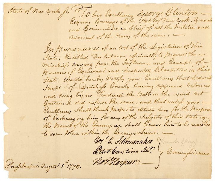 In pursuance of an Act of the Legislature of this State, Entitled “An Act more effectually to prevent the Mischiefs arising from the Influence and Example of persons of Equivocal and Suspected Characters in this State, We do hereby Notify your Excellency that Lodwick Strydt of Dutchess County having appeared before us and being by us Tendered the oath in the said but contained did refuse the same, and that unless your Excellency shall think proper to detain him for the purpose of Exchanging him for any of the Subjects of this State in the power of the Enemy, we shall Cause him to be removed to some place within the Enemy’s Lines. -- (Signed) “Corl. C. Schoonmaker -- Peter Cantine, Jnr. -- Robt. Harpur } Commissioners -- Poughkeepsie August 1st 1779.”