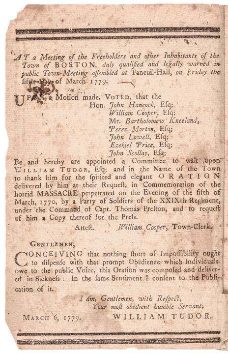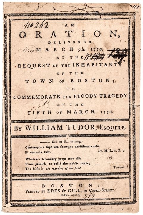 Each year since 1770, at a town meeting held in Faneuil Hall, a person was asked to deliver an oration to mark the anniversary of the Boston Massacre including Dr. Joseph Warren in 1772 and 1775 and John Hancock in 1774. William Tudor (1750-1819), Harvard Class of 1769, was one of John Adams’ law clerks when Adams was defending the British soldiers accused of the massacre. Tudor began his own practice in 1774. From 1775-1777, Capt. Tudor served as the chief legal officer on Gen. George Washington’s staff at Cambridge and later in New York City. Lieutenant Colonel and later Colonel, Tudor returned to Boston in 1777 and resigned his commission in 1778.